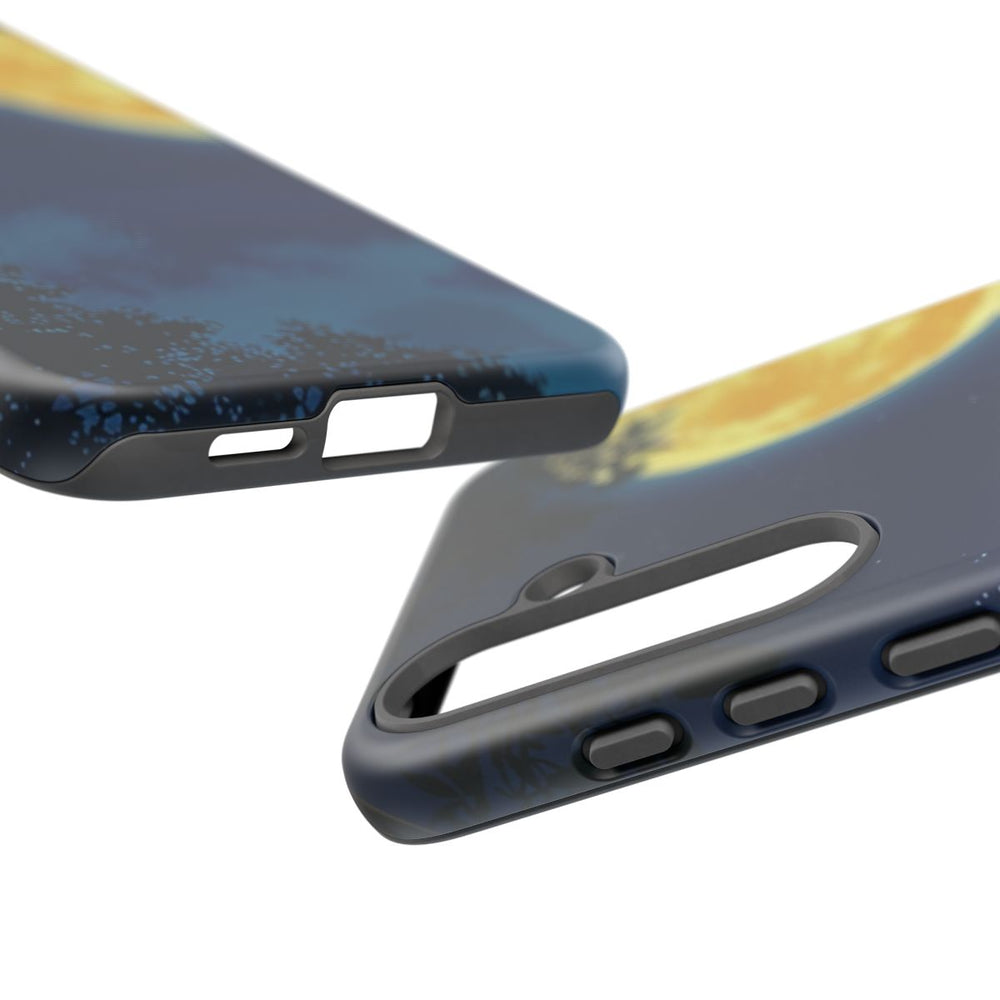 Dit ontwerp toont een grote, heldergele volle maan die straalt tegen een diepblauwe nachtelijke hemel. Zwarte silhouetten van boomtakken en bladeren omlijsten de maan en zorgen voor een natuurlijke, rustgevende uitstraling. Kleine sterren verspreid over de lucht versterken de sfeer van een stille nacht. De afbeelding is gedrukt op een mat telefoonhoesje van stevig polycarbonaat met een TPU-binnenzijde, wat extra bescherming biedt en draadloos opladen ondersteunt. De algehele uitstraling is kalm en vredig.