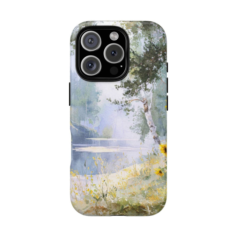 Dit ontwerp toont een rustiek aquareltafereel met heldergele zonnebloemen aan de oever van een kalm bosmeer. Op de achtergrond zijn hoge bomen te zien met zachtgroen bladerdek en een nevelige sfeer, wat zorgt voor een vredige, natuurlijke uitstraling. De afbeelding gebruikt lichte pasteltinten en zachte kleuren om de serene schoonheid van het landschap te benadrukken. Het telefoonhoesje heeft een dubbele laag van polycarbonaat en TPU voor extra stevigheid en bescherming, en is geschikt voor draadloos opladen.