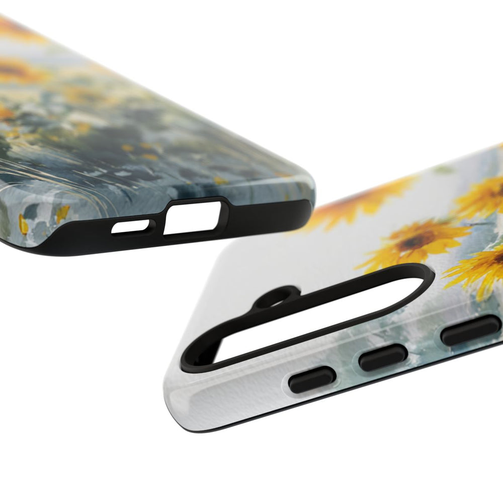 Dit hoesje heeft een aquarelillustratie van heldergele zonnebloemen tegen een zachte, pastelkleurige achtergrond. Op de achtergrond zijn lichte velden en verre bomen te zien, uitgevoerd in subtiele, rustige tinten voor een kalme en luchtige uitstraling. De zonnebloemen staan centraal, met gedetailleerde bloemblaadjes en groene bladeren. Het hoesje is glanzend en stevig, met een dubbele laag van een polycarbonaat buitenkant en TPU-binnenzijde. Dit zorgt voor extra bescherming en duurzaamheid, terwijl draadloos opladen mogelijk blijft.