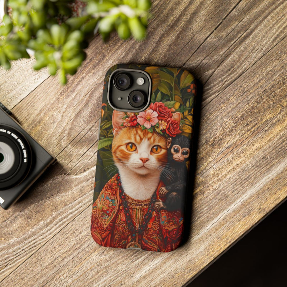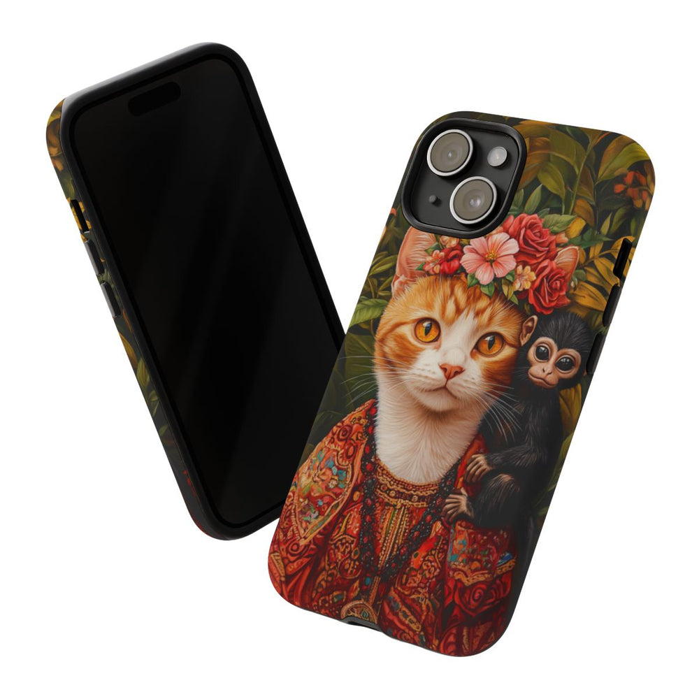 Dit ontwerp toont een levensechte gemberkleurige kat met amberkleurige ogen, versierd met een kleurrijke bloemenkroon van rode en roze bloemen. De kat draagt rijk gedetailleerde, traditioneel geborduurde kleding in rode tinten, afgewerkt met een kralenketting en een grote hanger. Op de schouder van de kat zit een klein zwart aapje. De achtergrond bestaat uit weelderig groene bladeren en oranje bloemen, wat zorgt voor een levendige en natuurlijke uitstraling. Het hoesje heeft een dubbele laag met een matte afwerking, een polycarbonaat buitenkant en een TPU-binnenzijde, en ondersteunt draadloos opladen.
