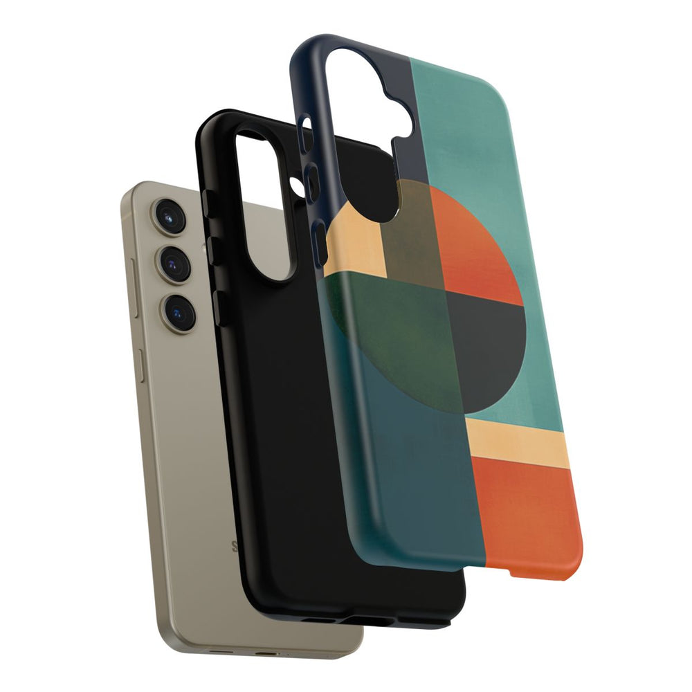 Dit telefoonhoesje heeft een geometrisch abstract ontwerp met opvallende vormen, waaronder een grote cirkel die is verdeeld in vier gekleurde kwadranten, diverse rechthoeken en gebogen figuren. Het kleurenpalet bestaat uit diep marineblauw, teal, gedempt groen, gebrand oranje en beige. De vormen zijn in een evenwichtige compositie geplaatst met gladde texturen en strakke lijnen. Het hoesje heeft een matte afwerking, is gemaakt van een polycarbonaat buitenkant met een TPU binnenzijde en biedt uitstekende bescherming en ondersteuning voor draadloos opladen.