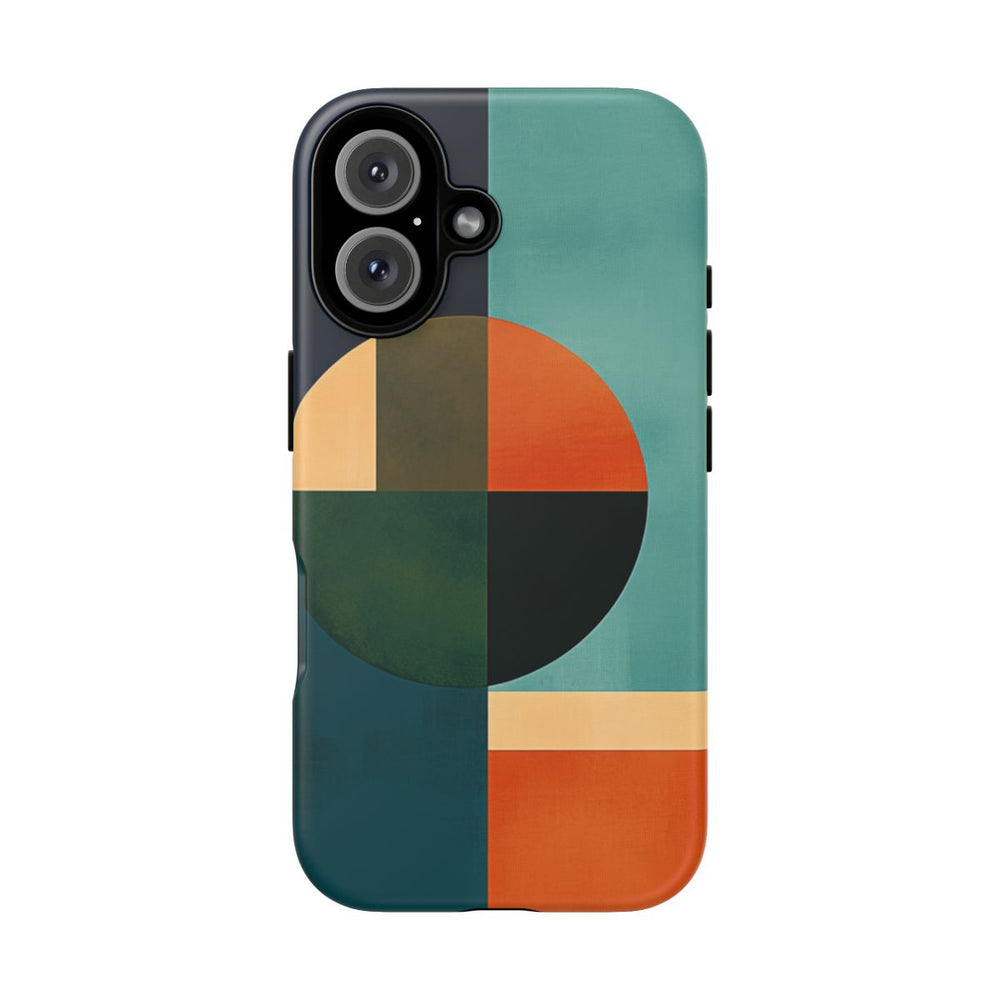 Dit hoesje heeft een abstract geometrisch ontwerp met opvallende vormen zoals cirkels, rechthoeken en halve cirkels. De kleurencombinatie bestaat uit diep marineblauw, teal, oranje, groen en beige, die samen zorgen voor een evenwichtige en moderne uitstraling. De afbeelding is geprint op een mat hoesje met een stevige polycarbonaat buitenkant en een TPU-binnenzijde voor extra stevigheid en bescherming. Geschikt voor draadloos opladen.