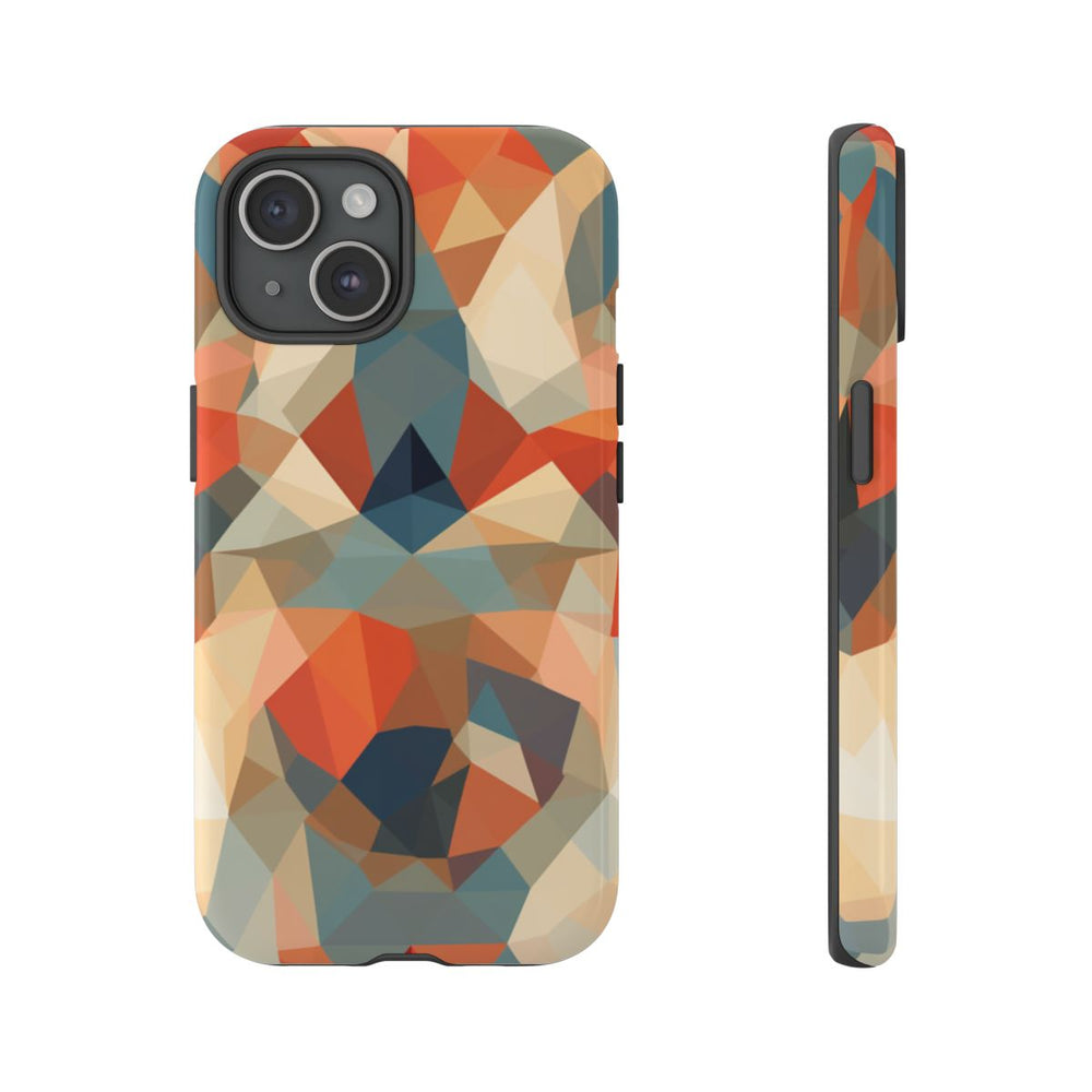 Dit hoesje heeft een naadloos geometrisch patroon met verschillende veelhoekige vormen. Het kleurenpalet bestaat uit gedempte warme tinten zoals rood, oranje, beige en accenten van blauw en grijs. Door de overlappende vormen ontstaat een abstract en facetachtig effect waarbij de kleuren subtiel in elkaar overlopen. Het hoesje is glanzend en extra stevig dankzij de combinatie van een polycarbonaat buitenkant en een TPU binnenlaag. Deze dubbele bescherming zorgt voor optimale veiligheid en ondersteunt draadloos opladen. Het ontwerp bedekt het volledige oppervlak van het hoesje.