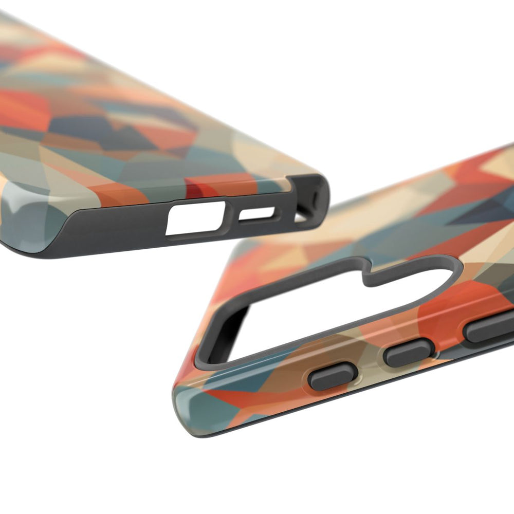 Dit hoesje heeft een naadloos geometrisch patroon met verschillende veelhoekige vormen. Het kleurenpalet bestaat uit gedempte warme tinten zoals rood, oranje, beige en accenten van blauw en grijs. Door de overlappende vormen ontstaat een abstract en facetachtig effect waarbij de kleuren subtiel in elkaar overlopen. Het hoesje is glanzend en extra stevig dankzij de combinatie van een polycarbonaat buitenkant en een TPU binnenlaag. Deze dubbele bescherming zorgt voor optimale veiligheid en ondersteunt draadloos opladen. Het ontwerp bedekt het volledige oppervlak van het hoesje.