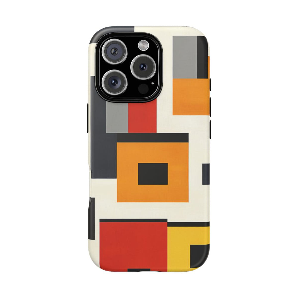 Dit telefoonhoesje heeft een abstract geometrisch patroon van rechthoeken en vierkanten in opvallende kleuren zoals zwart, rood, oranje, geel en grijs. De vormen liggen op een crèmekleurige of gebroken witte achtergrond met een lichte textuur, wat zorgt voor een moderne en minimalistische uitstraling. Het patroon is herhalend en gestructureerd, met strakke lijnen en sterke kleurcontrasten. Het ontwerp is gedrukt op een stevige, matte hoes met dubbele laag van polycarbonaat en TPU. Zo biedt het hoesje uitstekende bescherming en is het geschikt voor draadloos opladen.