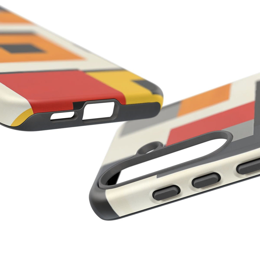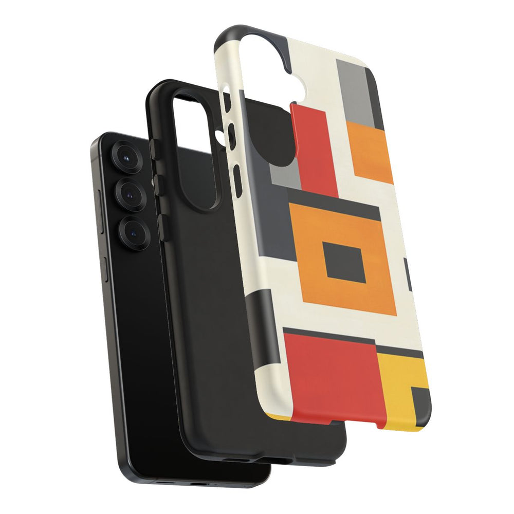 Dit telefoonhoesje heeft een abstract geometrisch patroon van rechthoeken en vierkanten in opvallende kleuren zoals zwart, rood, oranje, geel en grijs. De vormen liggen op een crèmekleurige of gebroken witte achtergrond met een lichte textuur, wat zorgt voor een moderne en minimalistische uitstraling. Het patroon is herhalend en gestructureerd, met strakke lijnen en sterke kleurcontrasten. Het ontwerp is gedrukt op een stevige, matte hoes met dubbele laag van polycarbonaat en TPU. Zo biedt het hoesje uitstekende bescherming en is het geschikt voor draadloos opladen.