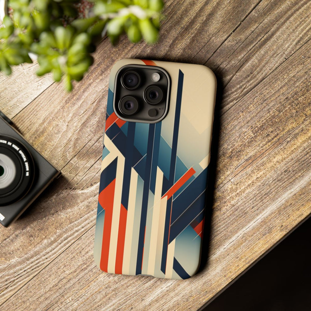Dit telefoonhoesje is voorzien van een geometrisch abstract patroon met kruislings lopende lijnen en vormen in donkerblauw, oranje en beige tinten. De lijnen verschillen in dikte en zorgen voor een dynamisch, gelaagd effect, waarbij sommige delen zachte kleurverlopen en subtiele schaduwen laten zien. De lichte beige achtergrond zorgt voor een mooi contrast met de opvallende gekleurde lijnen. Het ontwerp is gedrukt op een mat hoesje met een stevige dual-layer structuur van polycarbonaat en TPU, wat optimale bescherming en duurzaamheid biedt.