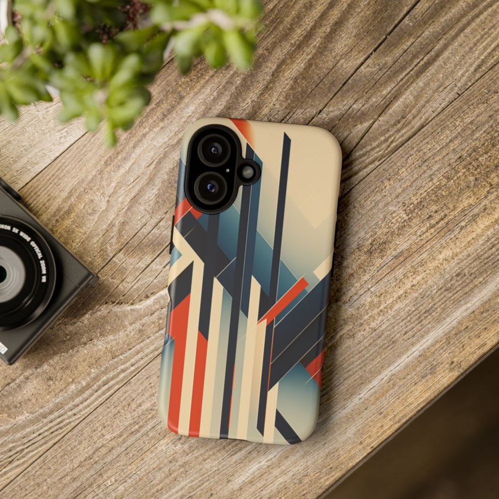 Dit telefoonhoesje is voorzien van een geometrisch abstract patroon met kruislings lopende lijnen en vormen in donkerblauw, oranje en beige tinten. De lijnen verschillen in dikte en zorgen voor een dynamisch, gelaagd effect, waarbij sommige delen zachte kleurverlopen en subtiele schaduwen laten zien. De lichte beige achtergrond zorgt voor een mooi contrast met de opvallende gekleurde lijnen. Het ontwerp is gedrukt op een mat hoesje met een stevige dual-layer structuur van polycarbonaat en TPU, wat optimale bescherming en duurzaamheid biedt.