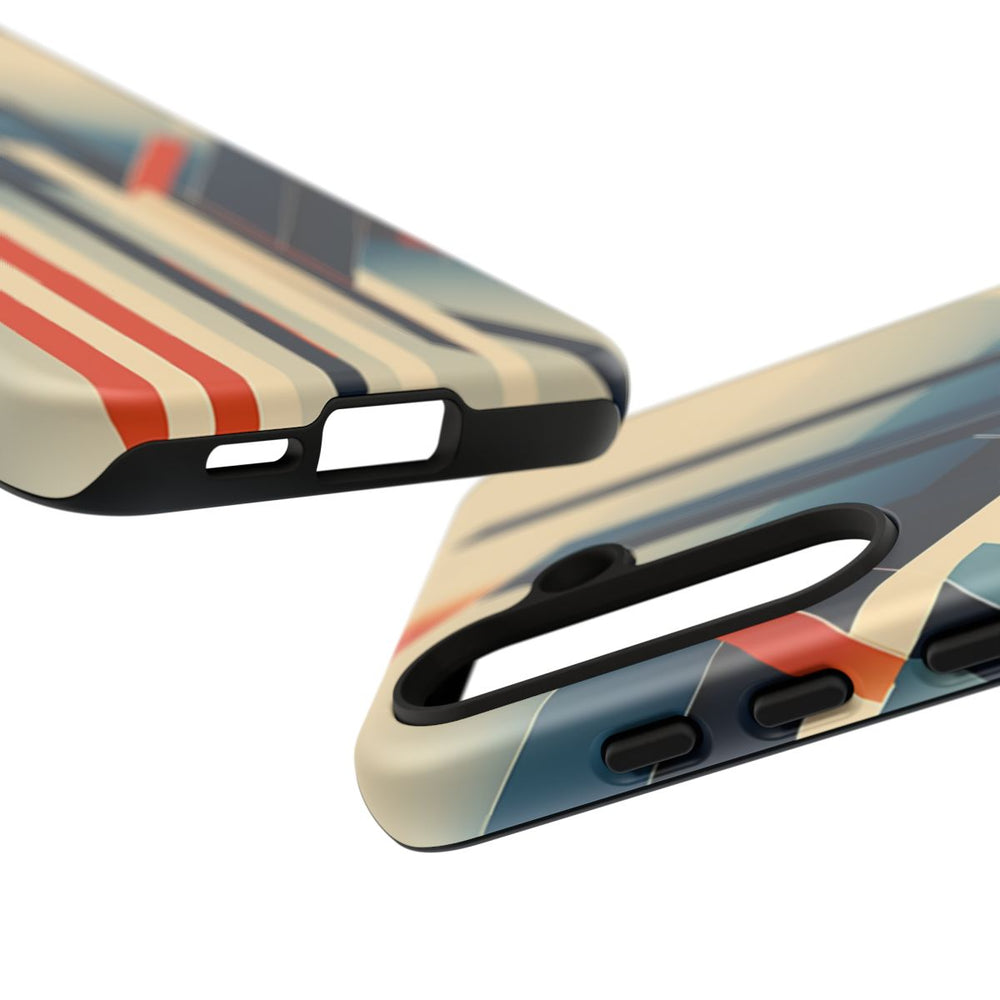 Dit telefoonhoesje is voorzien van een geometrisch abstract patroon met kruislings lopende lijnen en vormen in donkerblauw, oranje en beige tinten. De lijnen verschillen in dikte en zorgen voor een dynamisch, gelaagd effect, waarbij sommige delen zachte kleurverlopen en subtiele schaduwen laten zien. De lichte beige achtergrond zorgt voor een mooi contrast met de opvallende gekleurde lijnen. Het ontwerp is gedrukt op een mat hoesje met een stevige dual-layer structuur van polycarbonaat en TPU, wat optimale bescherming en duurzaamheid biedt.