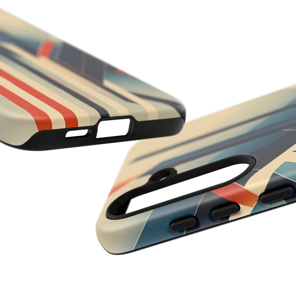 Dit telefoonhoesje is voorzien van een geometrisch abstract patroon met kruislings lopende lijnen en vormen in donkerblauw, oranje en beige tinten. De lijnen verschillen in dikte en zorgen voor een dynamisch, gelaagd effect, waarbij sommige delen zachte kleurverlopen en subtiele schaduwen laten zien. De lichte beige achtergrond zorgt voor een mooi contrast met de opvallende gekleurde lijnen. Het ontwerp is gedrukt op een mat hoesje met een stevige dual-layer structuur van polycarbonaat en TPU, wat optimale bescherming en duurzaamheid biedt.