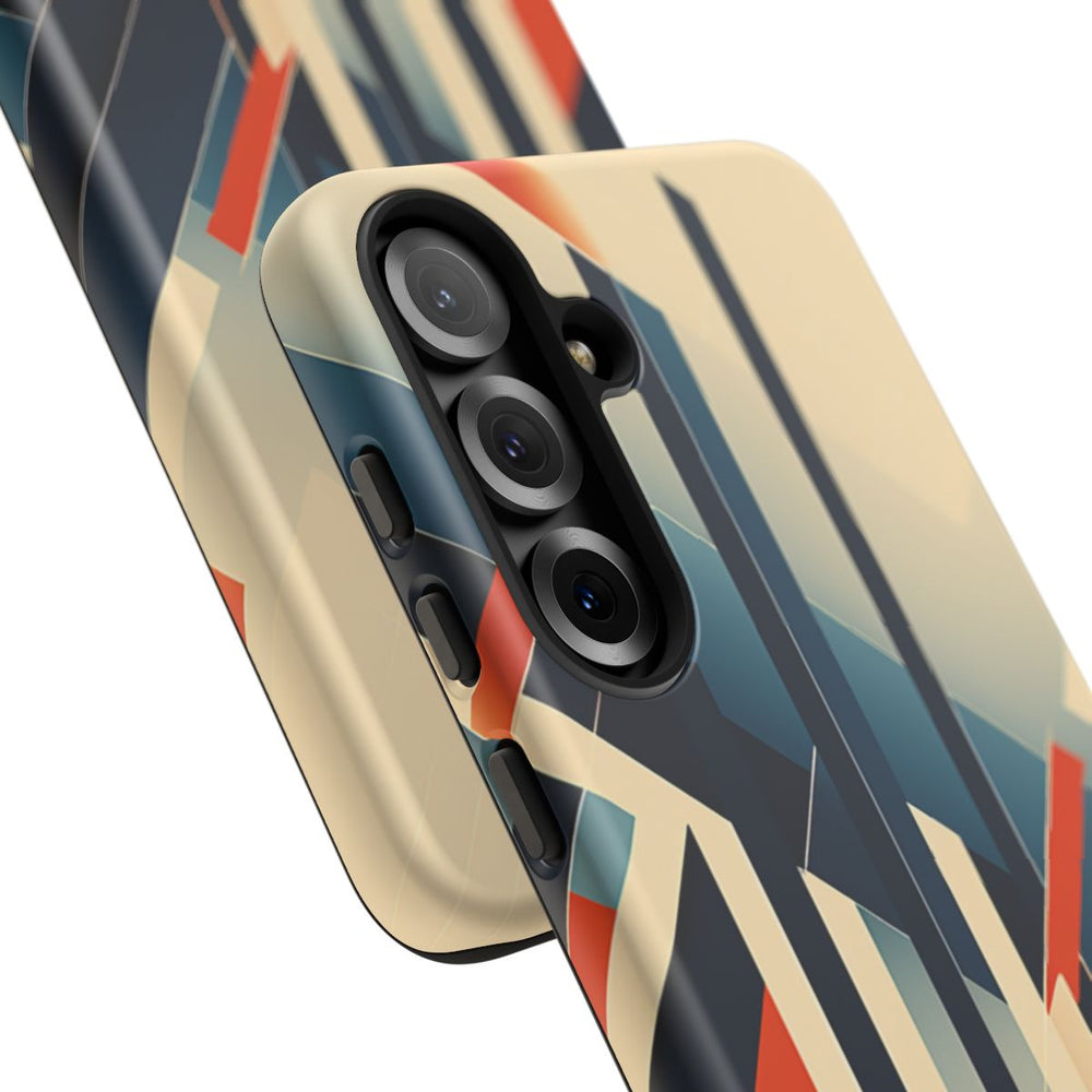 Dit telefoonhoesje is voorzien van een geometrisch abstract patroon met kruislings lopende lijnen en vormen in donkerblauw, oranje en beige tinten. De lijnen verschillen in dikte en zorgen voor een dynamisch, gelaagd effect, waarbij sommige delen zachte kleurverlopen en subtiele schaduwen laten zien. De lichte beige achtergrond zorgt voor een mooi contrast met de opvallende gekleurde lijnen. Het ontwerp is gedrukt op een mat hoesje met een stevige dual-layer structuur van polycarbonaat en TPU, wat optimale bescherming en duurzaamheid biedt.