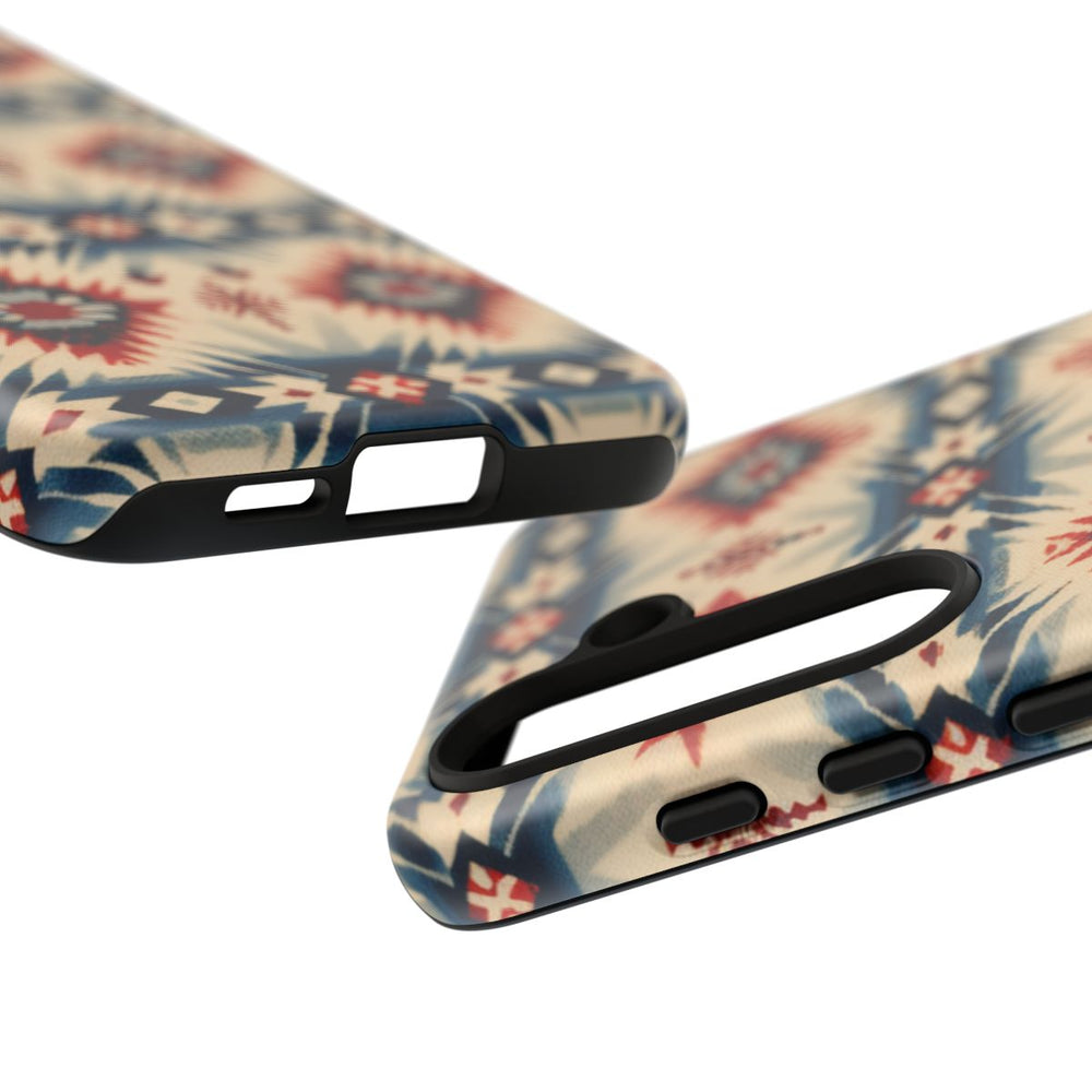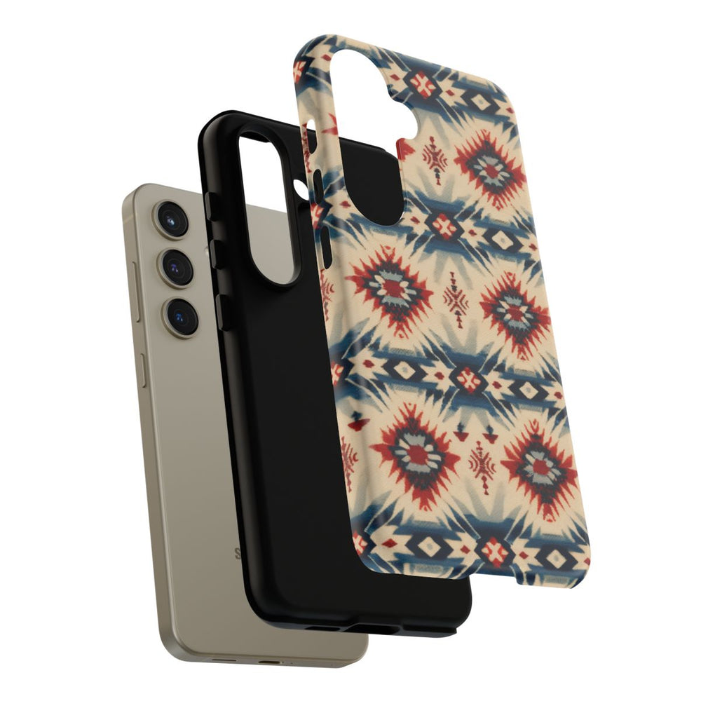 Dit telefoonhoesje heeft een herhalend geometrisch inheems patroon met ruit- en stervormen in rood, blauw en beige. De patronen zijn in horizontale banen geplaatst en hebben scherpe, hoekige details voor een opvallend effect. De zachte beige achtergrond laat de levendige rode en blauwe accenten extra opvallen. Het matte hoesje is voorzien van een stevige polycarbonaat buitenkant en een TPU-binnenzijde, wat zorgt voor extra duurzaamheid en bescherming, ook bij gebruik buitenshuis. Geschikt voor draadloos opladen.