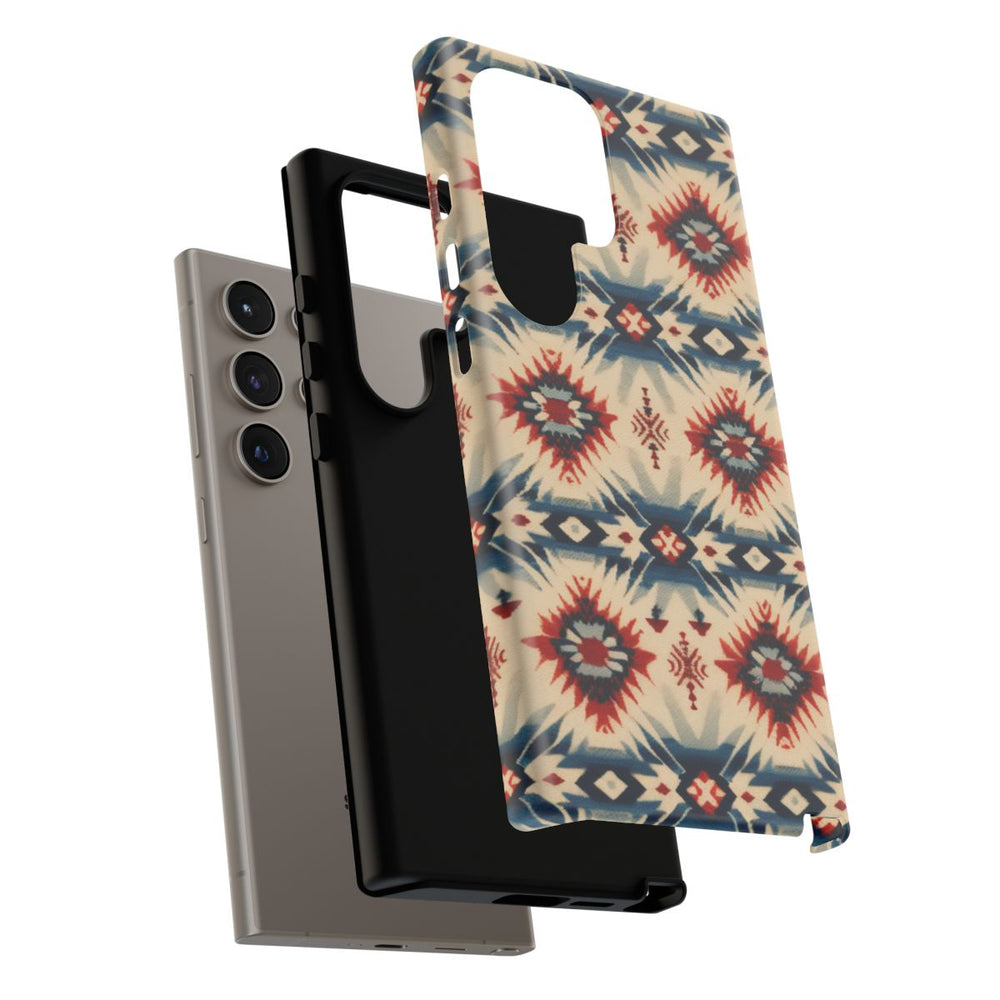 Dit telefoonhoesje heeft een herhalend geometrisch inheems patroon met ruit- en stervormen in rood, blauw en beige. De patronen zijn in horizontale banen geplaatst en hebben scherpe, hoekige details voor een opvallend effect. De zachte beige achtergrond laat de levendige rode en blauwe accenten extra opvallen. Het matte hoesje is voorzien van een stevige polycarbonaat buitenkant en een TPU-binnenzijde, wat zorgt voor extra duurzaamheid en bescherming, ook bij gebruik buitenshuis. Geschikt voor draadloos opladen.