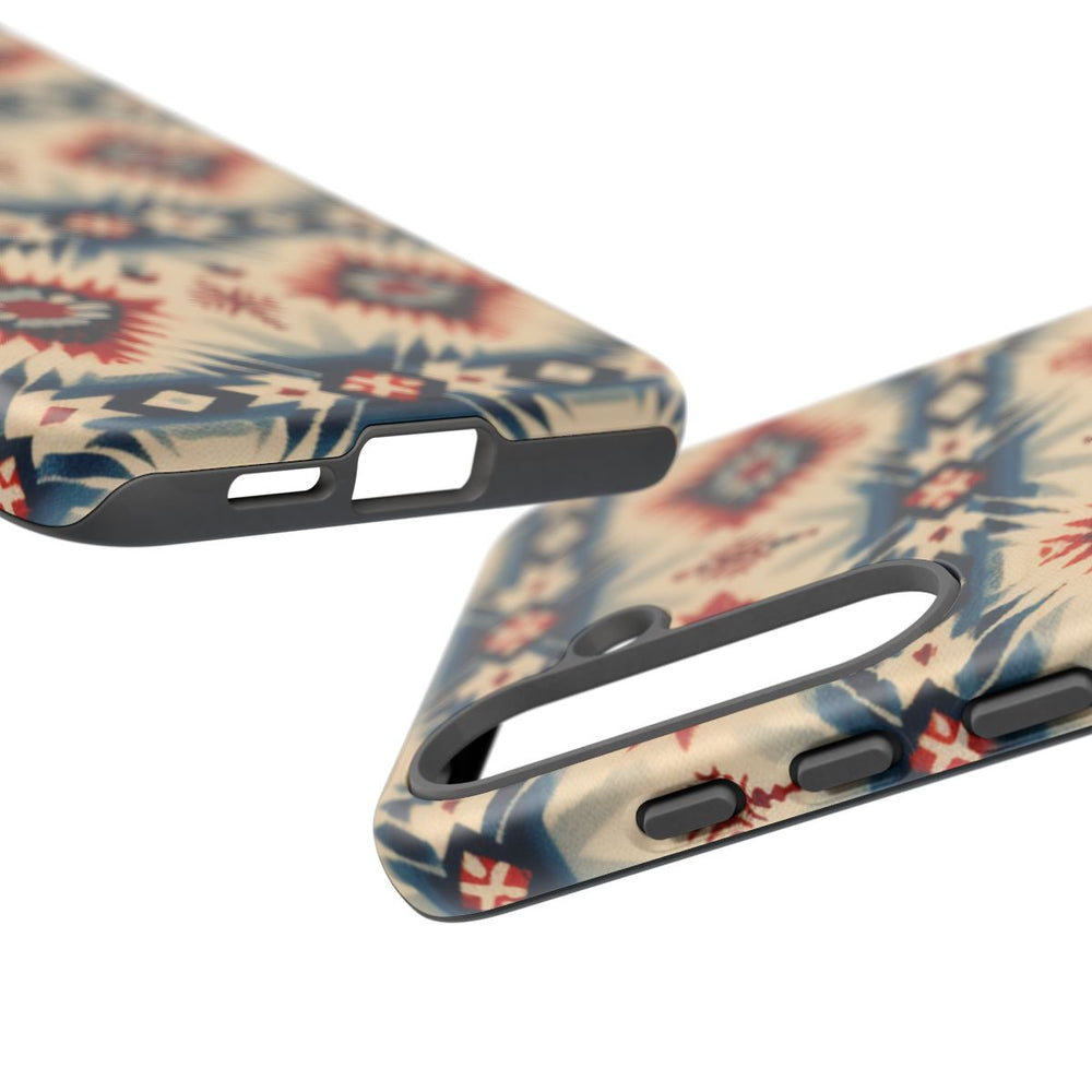 Dit telefoonhoesje heeft een herhalend geometrisch inheems patroon met ruit- en stervormen in rood, blauw en beige. De patronen zijn in horizontale banen geplaatst en hebben scherpe, hoekige details voor een opvallend effect. De zachte beige achtergrond laat de levendige rode en blauwe accenten extra opvallen. Het matte hoesje is voorzien van een stevige polycarbonaat buitenkant en een TPU-binnenzijde, wat zorgt voor extra duurzaamheid en bescherming, ook bij gebruik buitenshuis. Geschikt voor draadloos opladen.