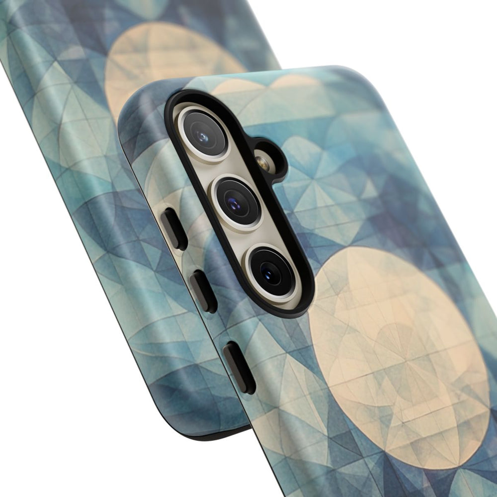 Dit hoesje heeft een geometrisch patroon waarin de zee en de maan samenkomen. Het ontwerp toont een grote cirkel die de maan voorstelt, omringd door verschillende tinten blauw en wit voor een kalme en serene uitstraling. Onderaan zijn golven van de oceaan te zien, die harmonieus overlopen in de weerspiegeling van de maan. Dit matte, stevige hoesje past perfect om de Galaxy S24 Plus en biedt een stijlvolle en beschermende oplossing voor je telefoon.