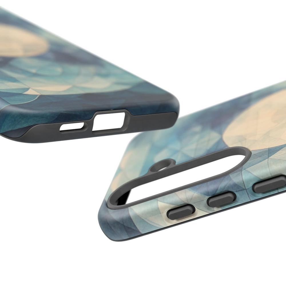 Dit hoesje heeft een geometrisch patroon waarin elementen van de zee en de maan samenkomen. In het midden prijkt een grote, ronde maan, omringd door verfijnde vormen en tinten blauw. Onderaan is een kalme zee te zien, wat zorgt voor een rustgevende uitstraling. Het matte hoesje is gemaakt van stevige materialen en beschermt je toestel optimaal, terwijl het unieke ontwerp goed tot zijn recht komt.