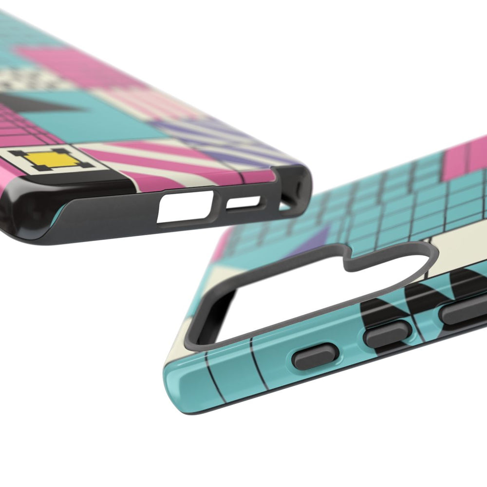Dit hoesje is voorzien van een herhalend geometrisch patroon met verschillende vormen, zoals vierkanten, driehoeken en rechthoeken. Het kleurenpalet bestaat uit tinten als teal, roze, crème, zwart, paars en subtiele accenten van geel en groen. Het patroon combineert strepen, rasterlijnen, stippen en abstracte vormen in een evenwichtige, betegelde opzet. Het hoesje heeft een glanzende afwerking en is extra stevig dankzij een dubbele laag van polycarbonaat en TPU. Biedt betrouwbare bescherming en is geschikt voor draadloos opladen.