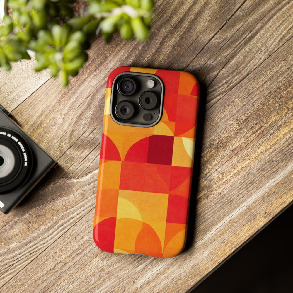 Dit hoesje is voorzien van een opvallend geometrisch patroon met diverse vormen, zoals vierkanten, cirkels en bogen. De warme kleuren rood, oranje en geel zorgen voor een levendig en dynamisch effect. De overlappende en elkaar snijdende vormen creëren een complex maar evenwichtig geheel met strakke lijnen en een subtiele textuur. Het patroon is gedrukt op een glanzend en stevig hoesje van polycarbonaat en TPU, dat bestaat uit twee lagen voor extra bescherming. Het hoesje is geschikt voor draadloos opladen.