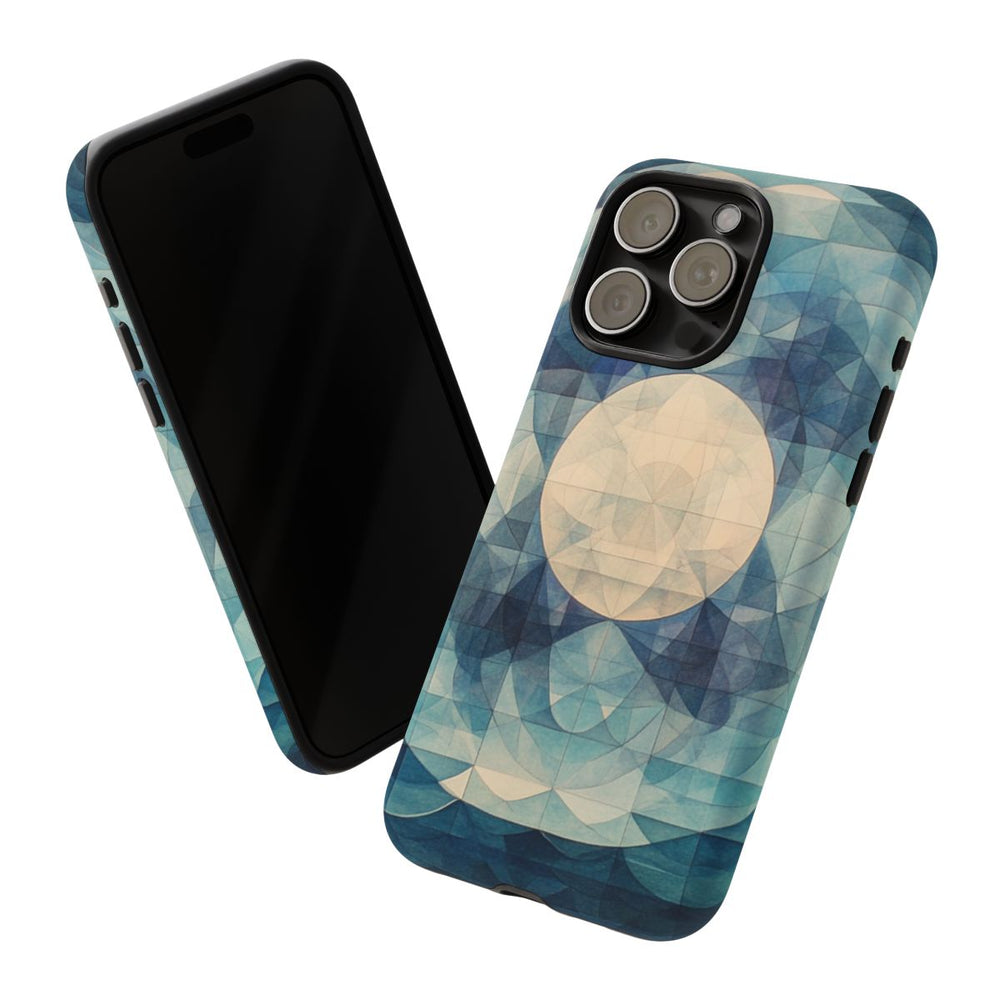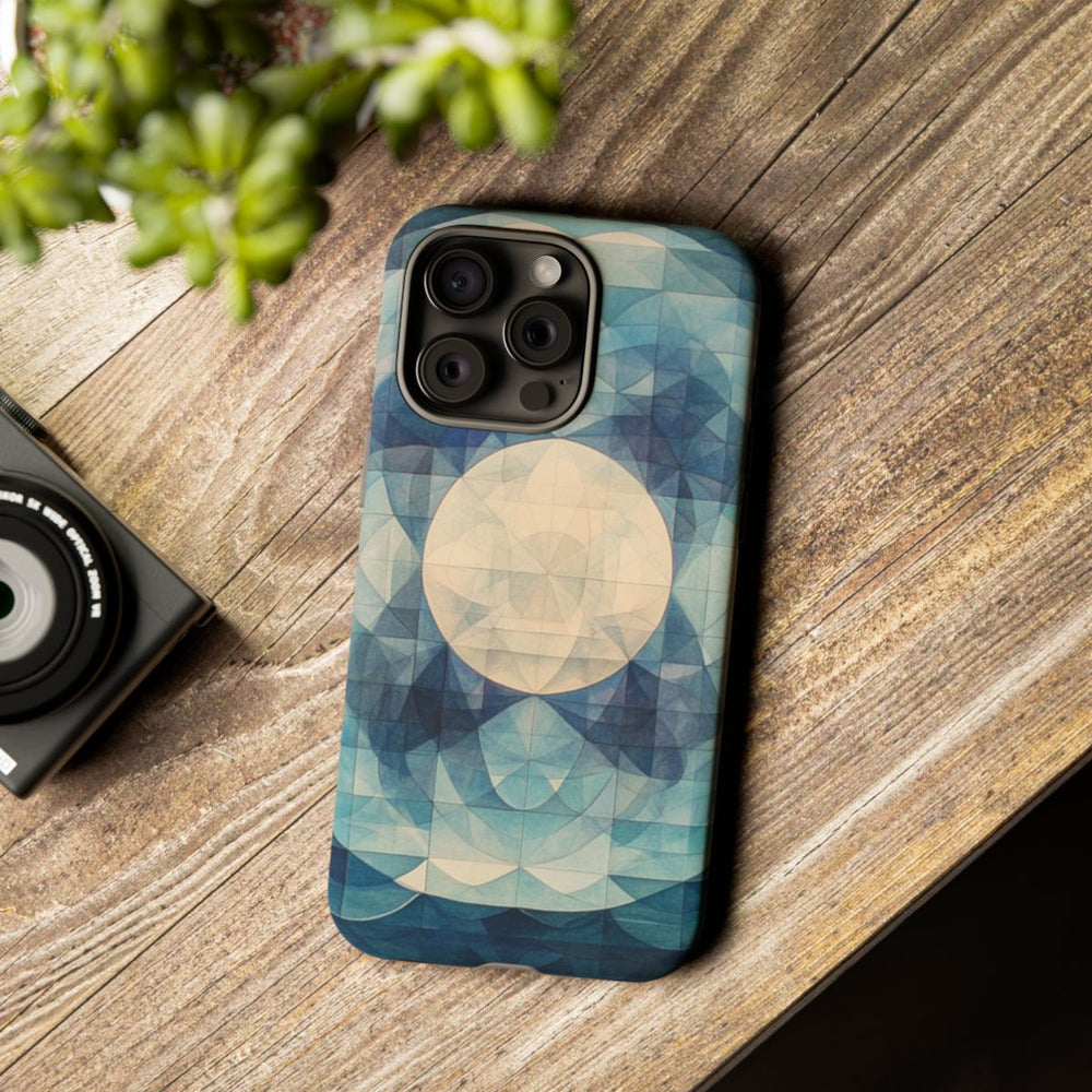 Dit telefoonhoesje heeft een geometrisch patroon waarin de zee en de maan samenkomen. Het ontwerp toont een grote, cirkelvormige maan, omringd door verschillende tinten blauw en lichte kleuren. Onderaan zijn subtiele golfbewegingen van de oceaan te zien, wat zorgt voor een rustige en harmonieuze uitstraling. Het hoesje bestaat uit twee lagen voor extra bescherming en is geschikt voor draadloos opladen. Ideaal voor liefhebbers van kunstzinnige en door de natuur geïnspireerde ontwerpen.