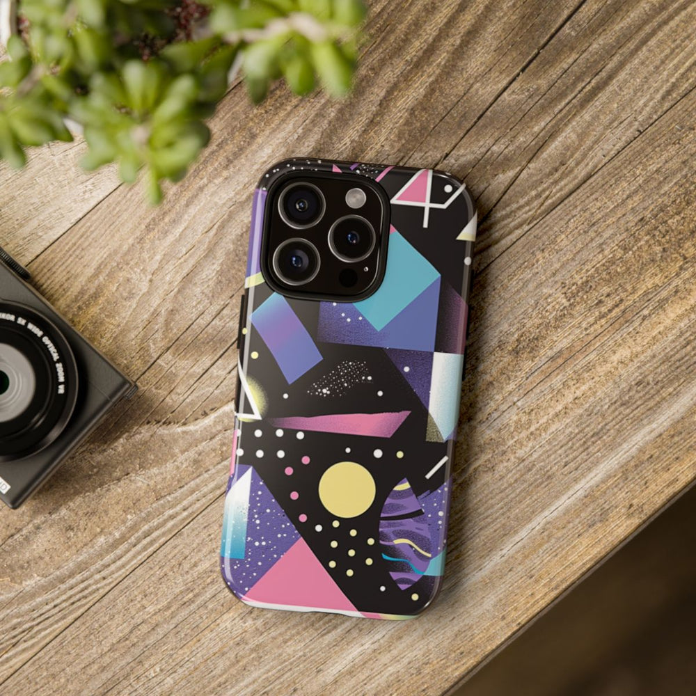 Dit telefoonhoesje heeft een opvallend abstract patroon met diverse geometrische vormen, zoals driehoeken, cirkels, rechthoeken en onregelmatige figuren. De kleuren bestaan uit tinten roze, paars, blauw, wit en geel op een zwarte achtergrond. Het ontwerp bevat gestippelde texturen en kleurverlopen, wat zorgt voor een dynamische en moderne vaporwave-uitstraling. Het hoesje is glanzend, stevig en gemaakt van polycarbonaat en TPU, waardoor het extra bescherming biedt en geschikt is voor draadloos opladen.