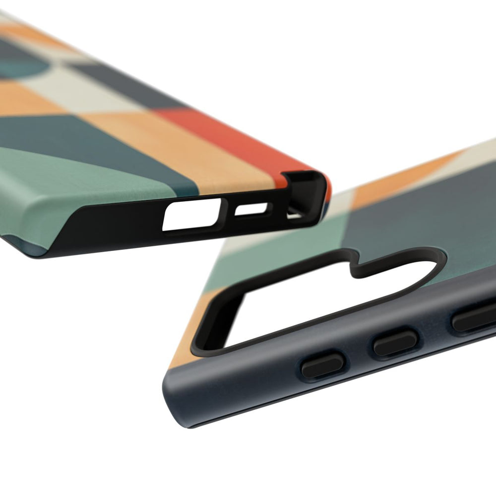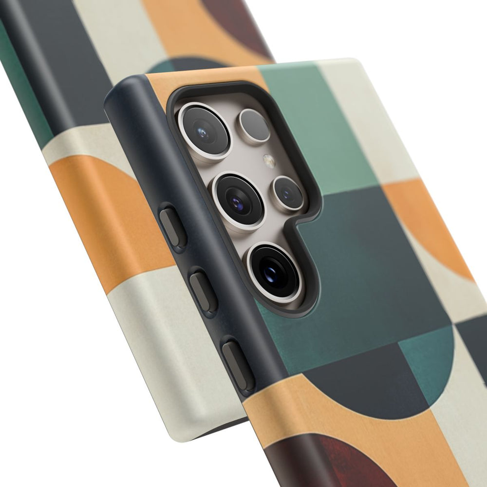 Dit hoesje heeft een stijlvol ontwerp met een uitgebalanceerde compositie van geometrische vormen zoals rechthoeken, vierkanten, cirkels en halve cirkels. De kleurencombinatie bestaat uit diep marineblauw, teal, gedempt groen, oranje, roestrood en beige. De vormen zijn gerangschikt in een rasterpatroon met een gladde textuur en een minimalistische uitstraling. Het matte hoesje is gemaakt van polycarbonaat en TPU en biedt stevige bescherming dankzij de dubbele laag. Geschikt voor draadloos opladen.