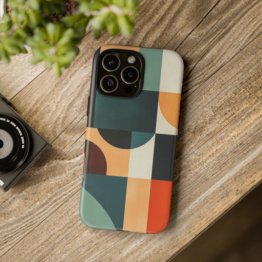 Dit ontwerp toont een harmonieus geheel van geometrische vormen zoals rechthoeken, vierkanten en cirkels in een warm kleurenschema. De kleuren die te zien zijn, omvatten diep marineblauw, teal, gebrand oranje, oker en crème. De vormen zijn strak en minimalistisch met een gladde afwerking, wat zorgt voor een moderne, abstracte uitstraling. Het hoesje bestaat uit twee lagen met een stevige polycarbonaat buitenkant en een TPU binnenzijde. Geschikt voor draadloos opladen en bestand tegen verschillende weersomstandigheden.