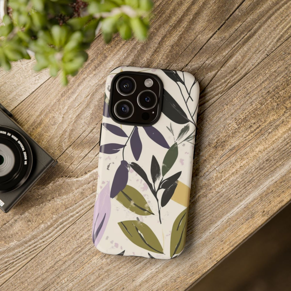 Dit ontwerp heeft een gestileerd botanisch patroon met diverse bladeren in olijfgroen, zwart, lavendel en pastelgeel. De bladeren zijn op een organische, vloeiende manier gerangschikt met zachte, minimalistische vormen op een lichtbeige achtergrond. Het patroon oogt modern en elegant en past perfect bij een mat telefoonhoesje van duurzaam polycarbonaat met een TPU-voering. Het hoesje ondersteunt draadloos opladen en biedt bescherming dankzij de dubbele laag.