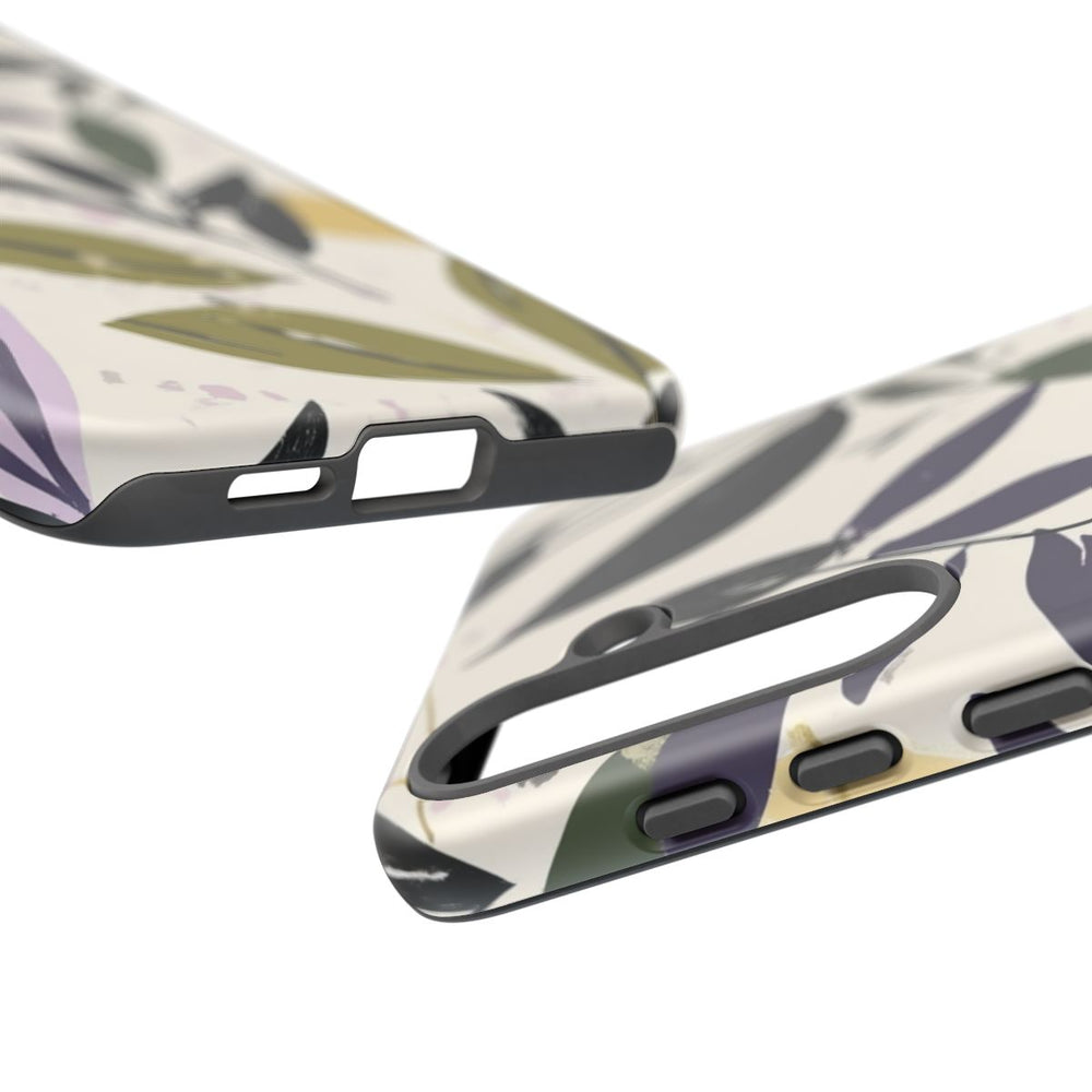 Dit ontwerp heeft een gestileerd botanisch patroon met diverse bladeren in olijfgroen, zwart, lavendel en pastelgeel. De bladeren zijn op een organische, vloeiende manier gerangschikt met zachte, minimalistische vormen op een lichtbeige achtergrond. Het patroon oogt modern en elegant en past perfect bij een mat telefoonhoesje van duurzaam polycarbonaat met een TPU-voering. Het hoesje ondersteunt draadloos opladen en biedt bescherming dankzij de dubbele laag.