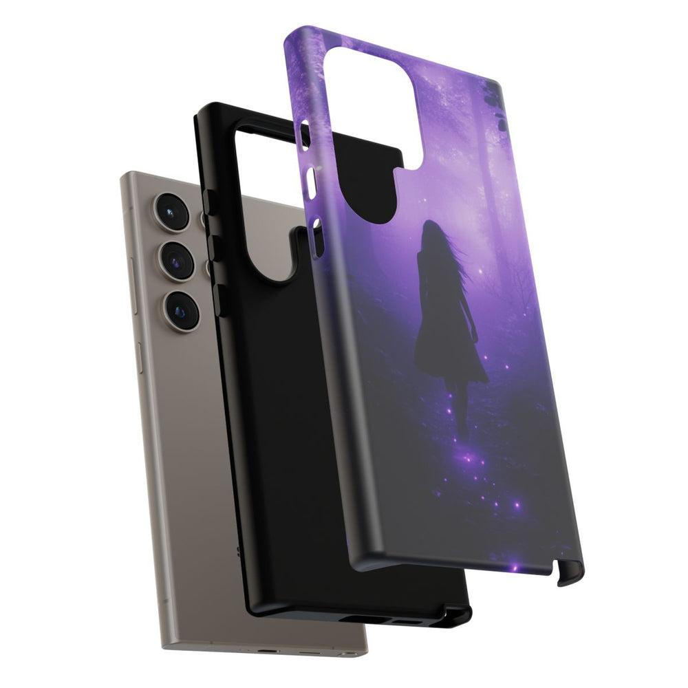 Dit hoesje toont het silhouet van een vrouw die door een donker bos loopt, verlicht door een mysterieuze paarse gloed. De dichte bomen en nevel zorgen voor een sfeervolle, geheimzinnige uitstraling. Kleine lichtgevende bolletjes en een vlinderachtige vorm geven het ontwerp een magisch accent. Het matte hoesje heeft een stevige dubbele laag van polycarbonaat en TPU, is geschikt voor draadloos opladen en biedt optimale bescherming, ook buitenshuis.