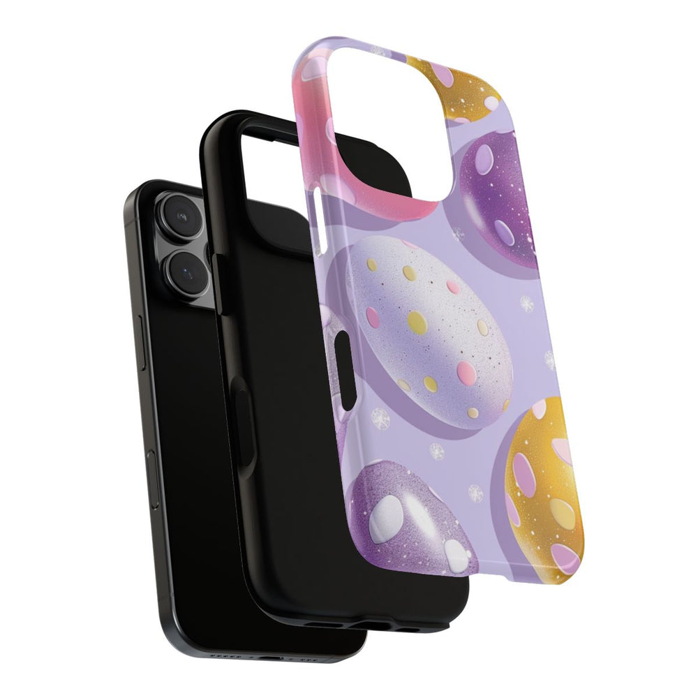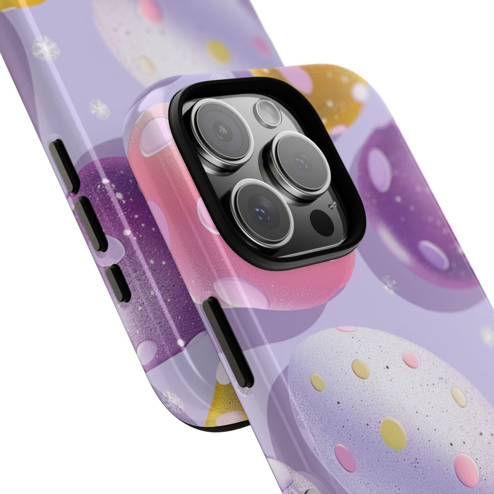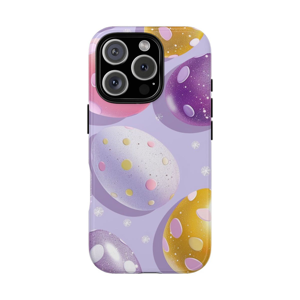 Dit hoesje heeft een naadloos patroon van glinsterende paaseieren op een zachte paarse achtergrond. De eieren zijn versierd met stippen in pastelkleuren zoals roze, geel, wit en paars. Elk ei heeft een glanzende, gespikkelde textuur die voor een sprankelend effect zorgt. Het vrolijke en feestelijke ontwerp maakt dit hoesje ideaal voor het voorjaar. Het stevige, glanzende hoesje is gemaakt van duurzame materialen en ondersteunt draadloos opladen.