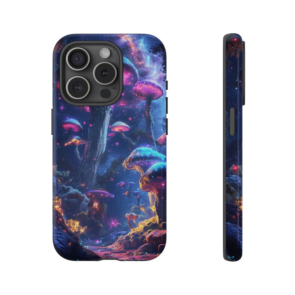 Dit hoesje toont een betoverend tafereel met reusachtige, lichtgevende paddenstoelen in levendige tinten blauw, paars en roze. De paddenstoelen verlichten een rotsachtige, oneffen ondergrond vol kleinere gloeiende zwammen. Op de achtergrond schittert een sterrenhemel met heldere kosmische kleuren en nevelachtige vormen. Donkere silhouetten van bomen omlijsten het geheel en zorgen voor een magische, buitenaardse sfeer. Het hoesje heeft een glanzende afwerking, is extra stevig en gemaakt van duurzame materialen. Ondersteunt draadloos opladen.