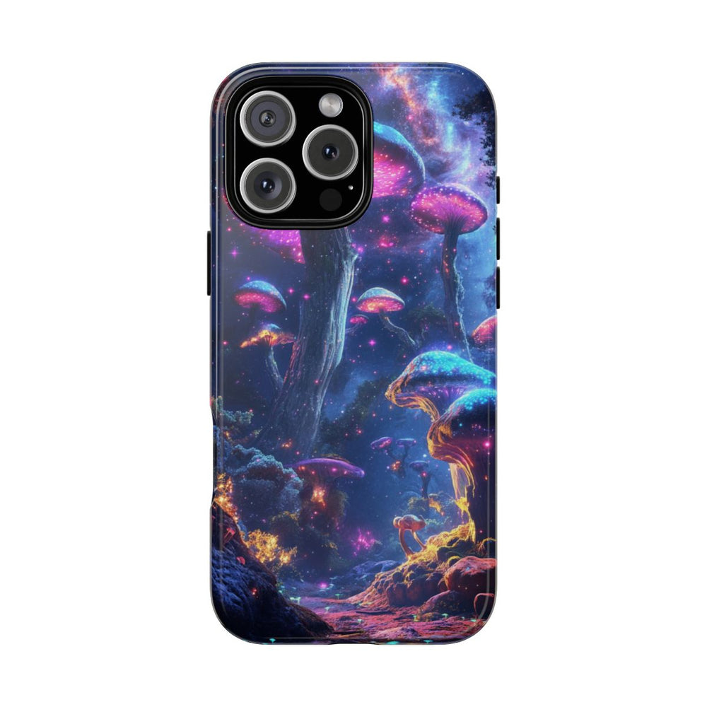 Dit hoesje toont een betoverend tafereel met reusachtige, lichtgevende paddenstoelen in levendige tinten blauw, paars en roze. De paddenstoelen verlichten een rotsachtige, oneffen ondergrond vol kleinere gloeiende zwammen. Op de achtergrond schittert een sterrenhemel met heldere kosmische kleuren en nevelachtige vormen. Donkere silhouetten van bomen omlijsten het geheel en zorgen voor een magische, buitenaardse sfeer. Het hoesje heeft een glanzende afwerking, is extra stevig en gemaakt van duurzame materialen. Ondersteunt draadloos opladen.