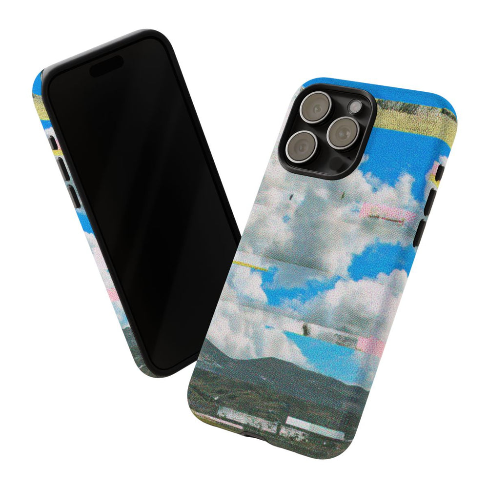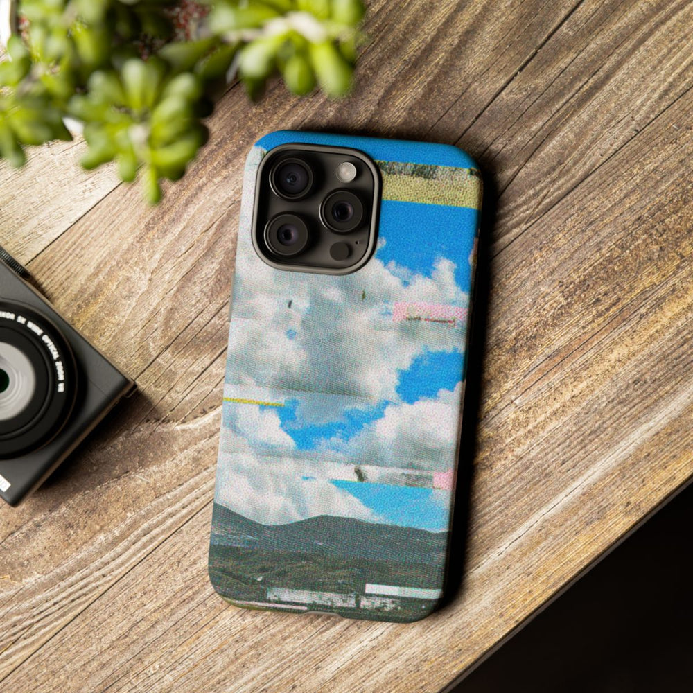 Dit hoesje toont een helderblauwe lucht met grote, witte wolken boven een donkere bergketen. De afbeelding is artistiek bewerkt met horizontale, gepixelde strepen en kleurvervormingen, wat zorgt voor een digitaal en abstract effect. Onderaan zie je groen landschap met enkele vage gebouwen. Het matte hoesje heeft een dubbele laag van polycarbonaat en TPU, waardoor het stevig is en geschikt voor draadloos opladen.