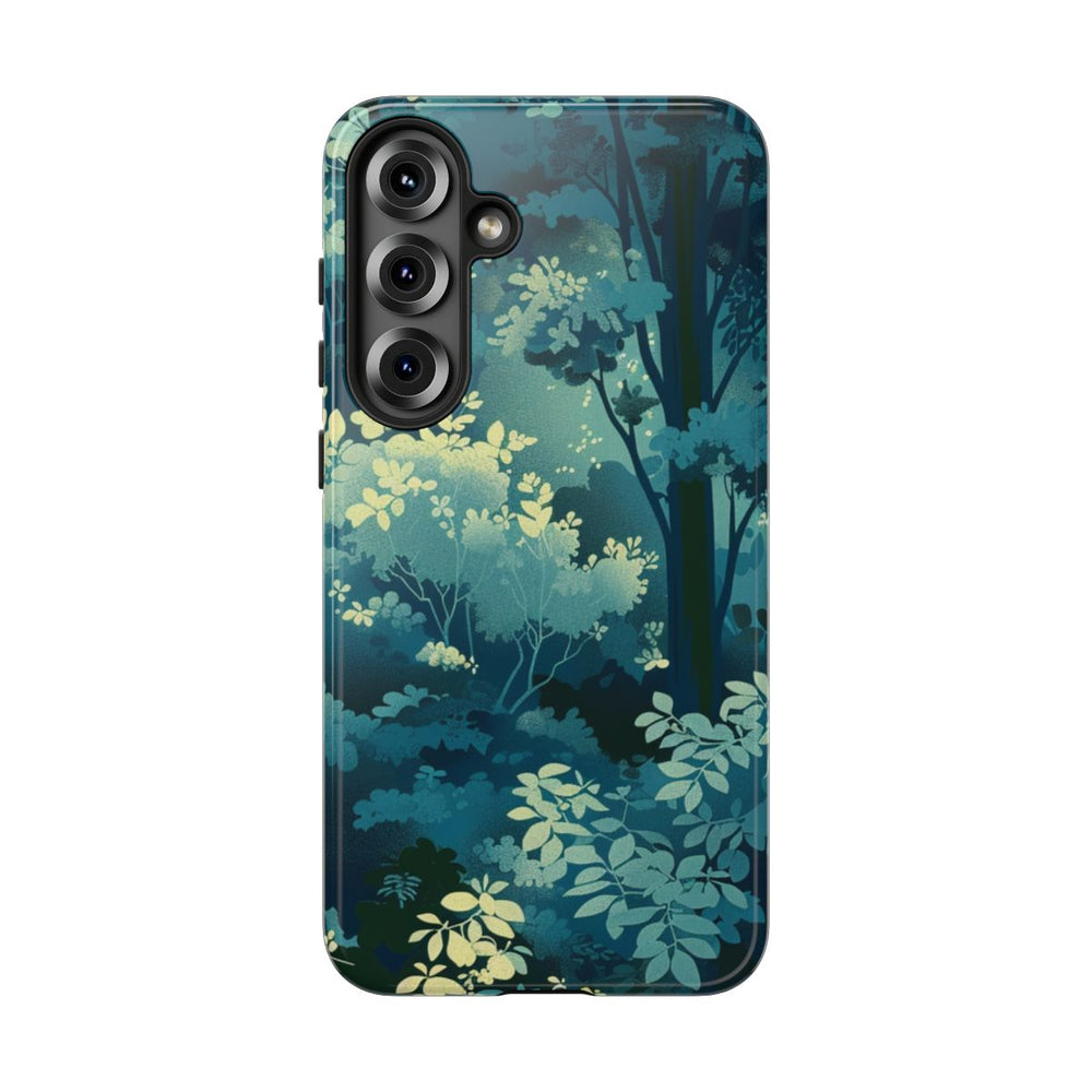 Dit ontwerp toont een dicht bos vol bladeren en bomen. De bladeren en takken zijn afgebeeld in verschillende tinten donkergroen en blauw, met lichtaccenten die door het bladerdek schijnen en zo een gelaagd en lichtgevend effect creëren. De afbeelding is gedetailleerd en gestileerd, en vangt de sfeer van een bos dat van achteren wordt verlicht. Dit glanzende, stevige hoesje heeft een dubbele laag van polycarbonaat en TPU voor optimale bescherming en duurzaamheid, en ondersteunt draadloos opladen.