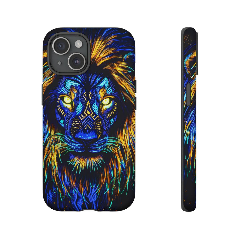 Dit ontwerp toont een indrukwekkende close-up van het gezicht van een leeuw, verlicht met levendige kleuren. De manen van de leeuw stralen in vloeiende tinten blauw, goud en oranje, wat zorgt voor een mystieke uitstraling. De heldere ogen versterken de krachtige aanwezigheid van het dier. De achtergrond is voorzien van zachte, kosmische deeltjes die het geheel een dromerig karakter geven. Dit matte, stevige hoesje is gemaakt van een duurzame polycarbonaat buitenkant en een TPU binnenzijde, waardoor je toestel uitstekend beschermd is en het bijzondere kunstwerk goed tot zijn recht komt.