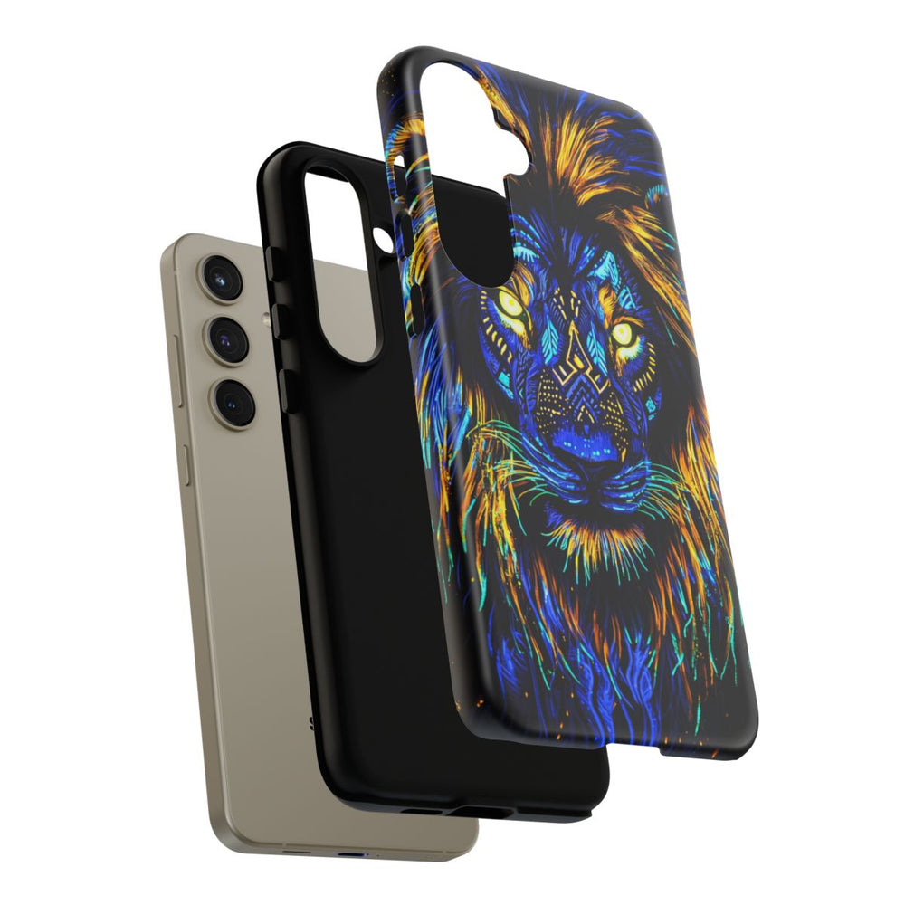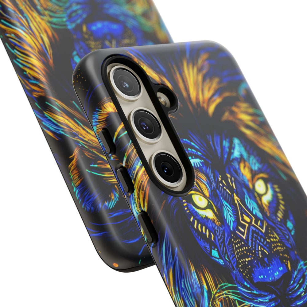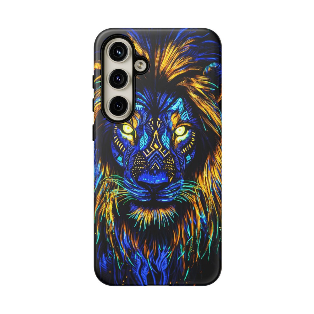 Dit ontwerp toont een close-up van het gezicht van een leeuw, verlicht met levendige kleuren. De manen stralen in golvende slierten blauw, goud en oranje licht. De ogen schitteren fel en stralen kracht en wijsheid uit. De vacht is versierd met gloeiende tribale patronen voor een mystiek effect. De achtergrond is gevuld met zachte kosmische deeltjes, wat de epische uitstraling van het geheel versterkt. Dit stevige hoesje is gemaakt van duurzame materialen en biedt uitstekende bescherming voor je toestel.