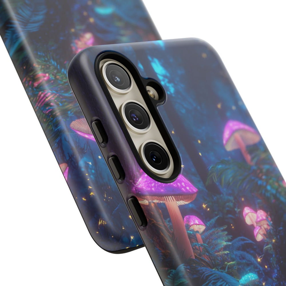 Dit ontwerp toont een sprookjesachtig bos vol gloeiende paddenstoelen in levendige tinten roze en blauw. Een rustige beek stroomt door het weelderige groen, omgeven door varens en verlicht door dansende vuurvliegjes. De magische sfeer zorgt voor een betoverend gevoel en is ideaal voor liefhebbers van de natuur. Dit matte, stevige hoesje is gemaakt van duurzame materialen en beschermt je toestel terwijl het dit bijzondere ontwerp laat zien.