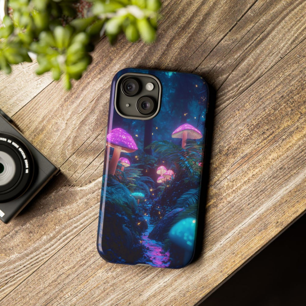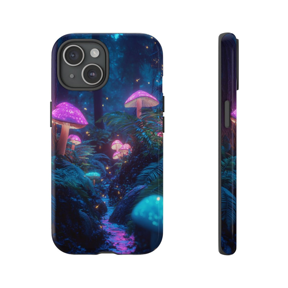 Dit hoesje toont een betoverend boslandschap in de nacht, met gloeiende paddenstoelen in levendige paarse en blauwe tinten. Het zachte licht van de paddenstoelen verlicht de varens en de bosgrond, terwijl kleine lichtdeeltjes sierlijk door de lucht zweven en een magische sfeer creëren. Op de achtergrond zijn hoge, donkere boomstammen zichtbaar tegen een diepblauwe hemel. De afbeelding is gedrukt op een glanzend en stevig hoesje met een buitenkant van polycarbonaat en een binnenzijde van TPU. Zo biedt het hoesje optimale bescherming en is het geschikt voor draadloos opladen.