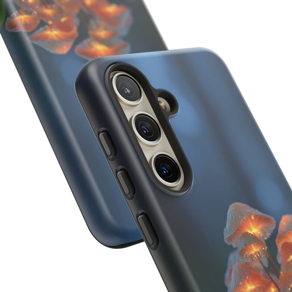 Dit hoesje toont een close-up van kleine paddenstoelen die zacht van binnenuit oplichten, tegen de achtergrond van een donker, regenachtig bos. De paddenstoelen staan samen op een bed van groen mos, terwijl zichtbare regendruppels naar beneden vallen. De afbeelding straalt een serene, mystieke sfeer uit, met koele blauwtinten op de achtergrond en warm oranje licht van de paddenstoelen. Het hoesje bestaat uit twee lagen met een matte afwerking van polycarbonaat en TPU, is geschikt voor draadloos opladen en biedt bescherming tegen verschillende weersomstandigheden.