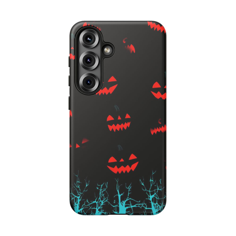 Dit ontwerp toont meerdere gloeiende rode pompoengezichten met scherpe, driehoekige ogen en grillige monden die boven een rij kale, blauwe bomen zweven. De effen zwarte achtergrond zorgt voor een opvallend contrast en benadrukt de griezelige, Halloween-achtige sfeer. Het hoesje heeft een matte afwerking en bestaat uit een stevige polycarbonaat buitenkant met een TPU-binnenzijde, wat zorgt voor dubbele bescherming. Daarnaast is het hoesje geschikt voor draadloos opladen. De stijl is zowel spannend als kleurrijk.