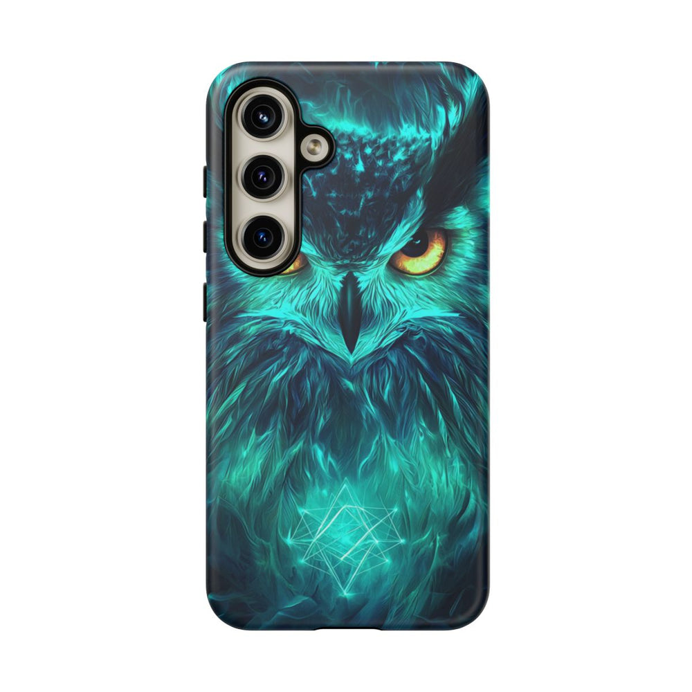 Dit telefoonhoesje is voorzien van een opvallend uilengezicht met grote, gloeiende amberkleurige ogen. Rondom de uil zijn levendige, lichtgevende veren te zien in diepe blauw- en groentinten. Geometrische lichtsymbolen zijn subtiel verwerkt in het verendek, wat een intrigerend detail toevoegt. De mysterieuze gloed rond het hoofd van de uil versterkt de betoverende uitstraling. Het ontwerp wordt geprint op een stevig mat hoesje dat optimale bescherming biedt voor je toestel.