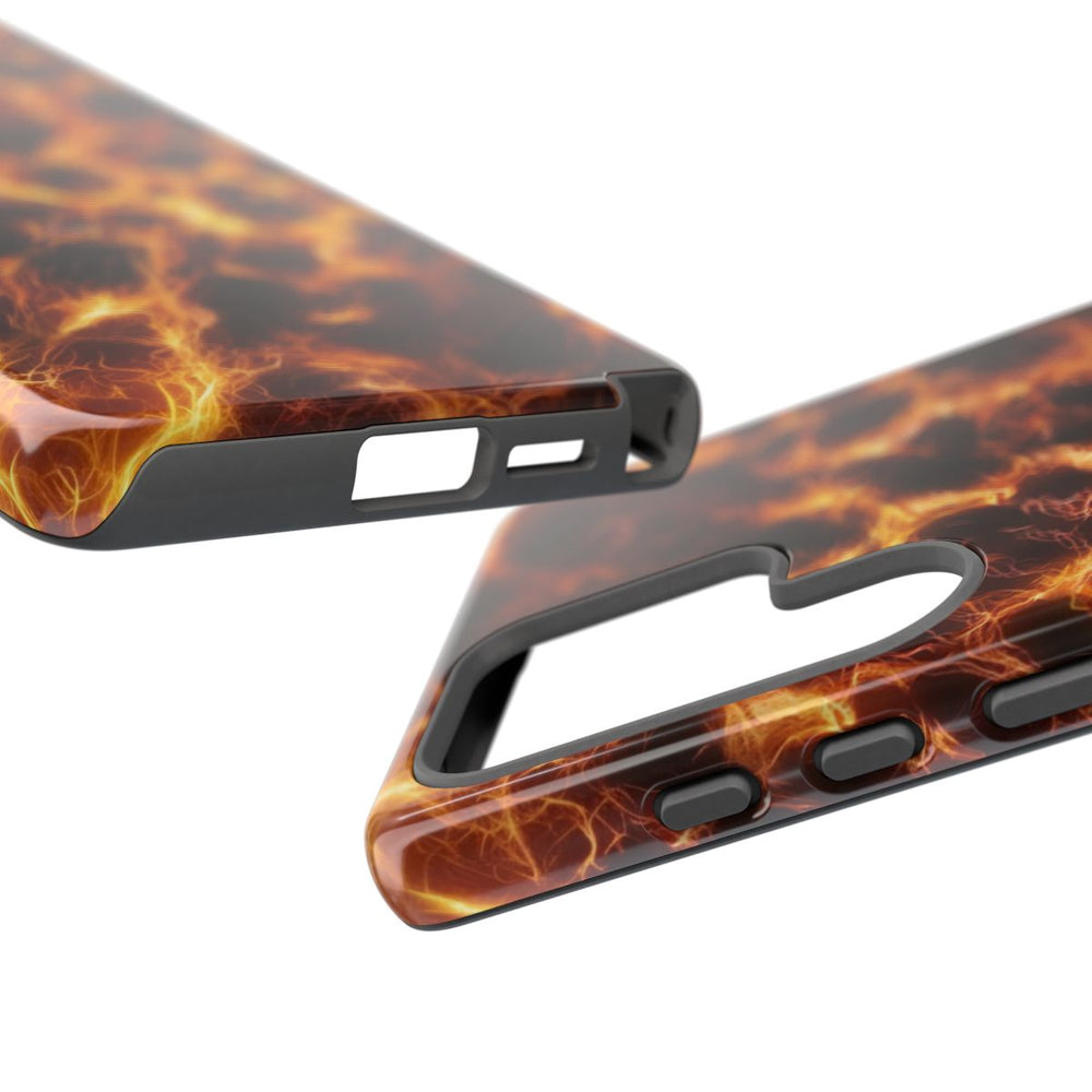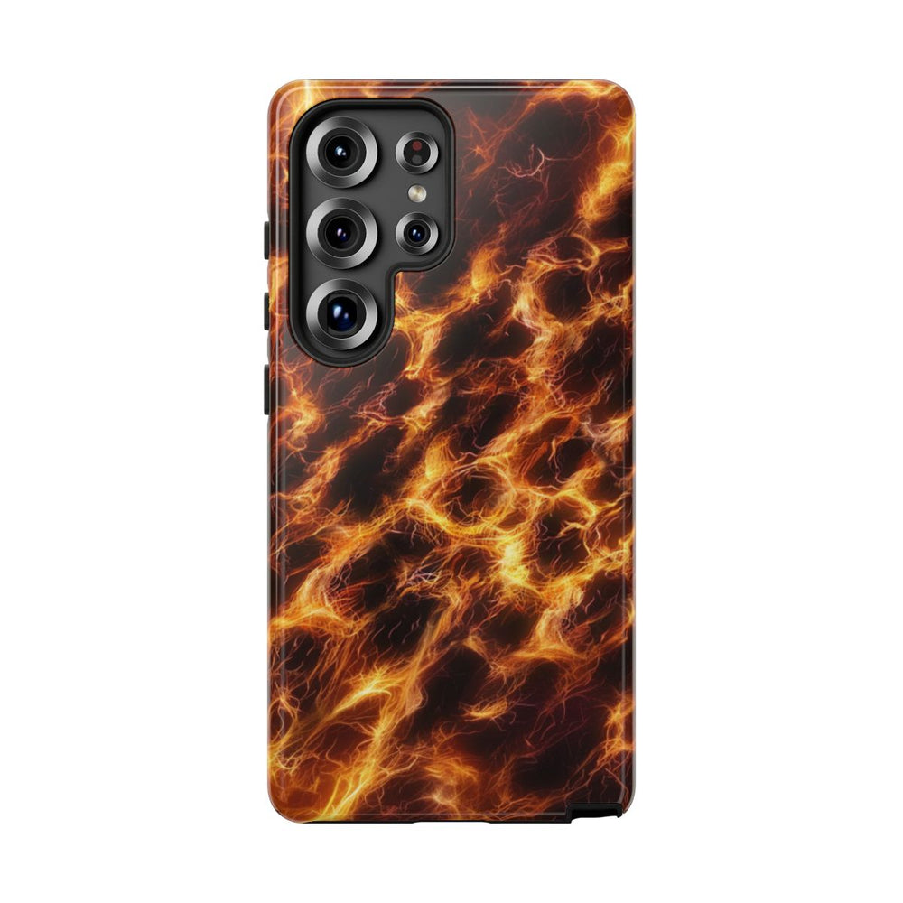Dit hoesje heeft een opvallend patroon van gloeiende, vurige lijnen die doen denken aan vezelachtige draden of plasmagolven. Heldere oranje en gele lichtstrepen steken krachtig af tegen een diepe zwarte achtergrond, wat zorgt voor een dynamisch en energiek effect. Het naadloze patroon bedekt het hele hoesje en is perfect voor een glanzende, stevige bescherming. De stevige buitenkant van polycarbonaat en de TPU-binnenkant bieden optimale duurzaamheid. Geschikt voor draadloos opladen.