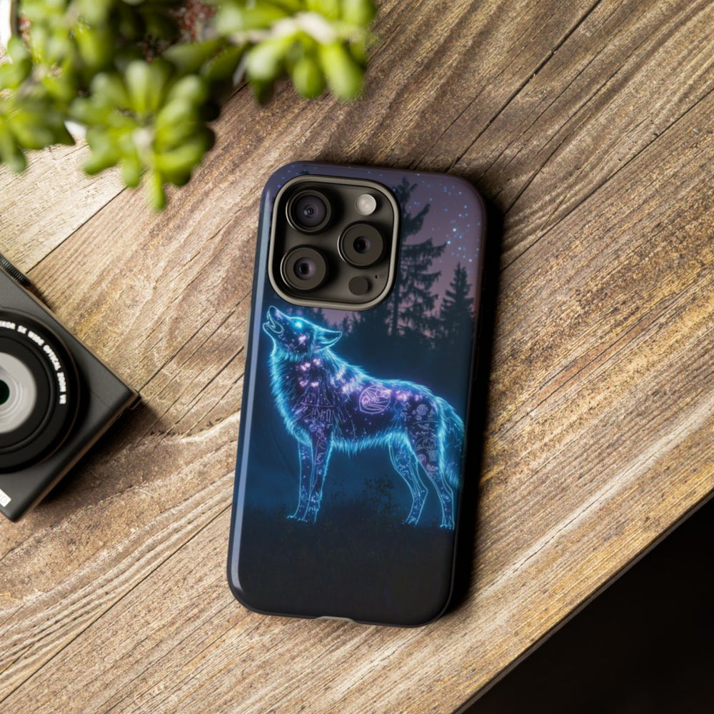 Dit hoesje toont een wolf die straalt in een donkere open plek in het bos, midden in de nacht. De contouren van de wolf lichten op in helderblauw en paars, wat de vacht en het lichaam accentueert. Op de vacht zijn verfijnde, lichtgevende oeroude symbolen te zien. Op de achtergrond staan hoge dennenbomen afgebeeld, afgetekend tegen een sterrenhemel. Het hoesje heeft een glanzende, stevige buitenkant van polycarbonaat en een TPU-binnenzijde, waardoor het duurzaam is en geschikt voor draadloos opladen.