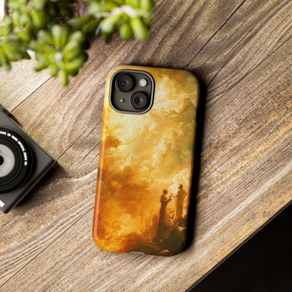 Dit ontwerp toont twee figuren gehuld in klassieke gewaden, staand te midden van een uitgestrekt landschap van gouden wolken. De figuren lijken met elkaar in gesprek of in observatie, terwijl het tafereel wordt overspoeld door warm, goudkleurig licht. De achtergrond bestaat uit gedetailleerde wolkenpartijen, wat zorgt voor een gevoel van diepte en grootsheid. De afbeelding is gedrukt op een glanzend, stevig hoesje van polycarbonaat en TPU, dat bestaat uit twee lagen voor extra bescherming en geschikt is voor draadloos opladen.