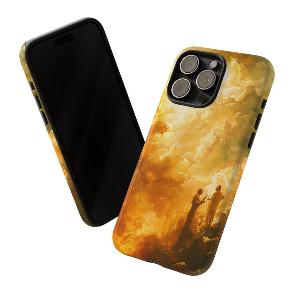 Dit ontwerp toont twee figuren gehuld in klassieke gewaden, staand te midden van een uitgestrekt landschap van gouden wolken. De figuren lijken met elkaar in gesprek of in observatie, terwijl het tafereel wordt overspoeld door warm, goudkleurig licht. De achtergrond bestaat uit gedetailleerde wolkenpartijen, wat zorgt voor een gevoel van diepte en grootsheid. De afbeelding is gedrukt op een glanzend, stevig hoesje van polycarbonaat en TPU, dat bestaat uit twee lagen voor extra bescherming en geschikt is voor draadloos opladen.