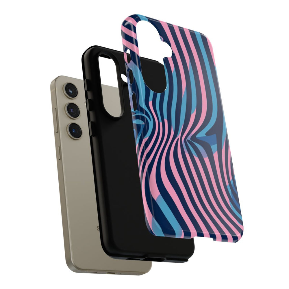 Dit telefoonhoesje heeft een opvallend optisch illusiepatroon met golvende, vloeiende lijnen in blauwe en roze tinten. De lijnen zorgen voor een gevoel van beweging en diepte, wat het ontwerp een speels en psychedelisch karakter geeft. Het patroon loopt diagonaal over het hoesje, waardoor het dynamische effect extra wordt versterkt. Dit glanzende, stevige hoesje is gemaakt van een polycarbonaat buitenkant met een TPU binnenzijde en biedt dubbele bescherming. Het ondersteunt draadloos opladen en is bestand tegen weersinvloeden, zodat het ontwerp langdurig mooi blijft.