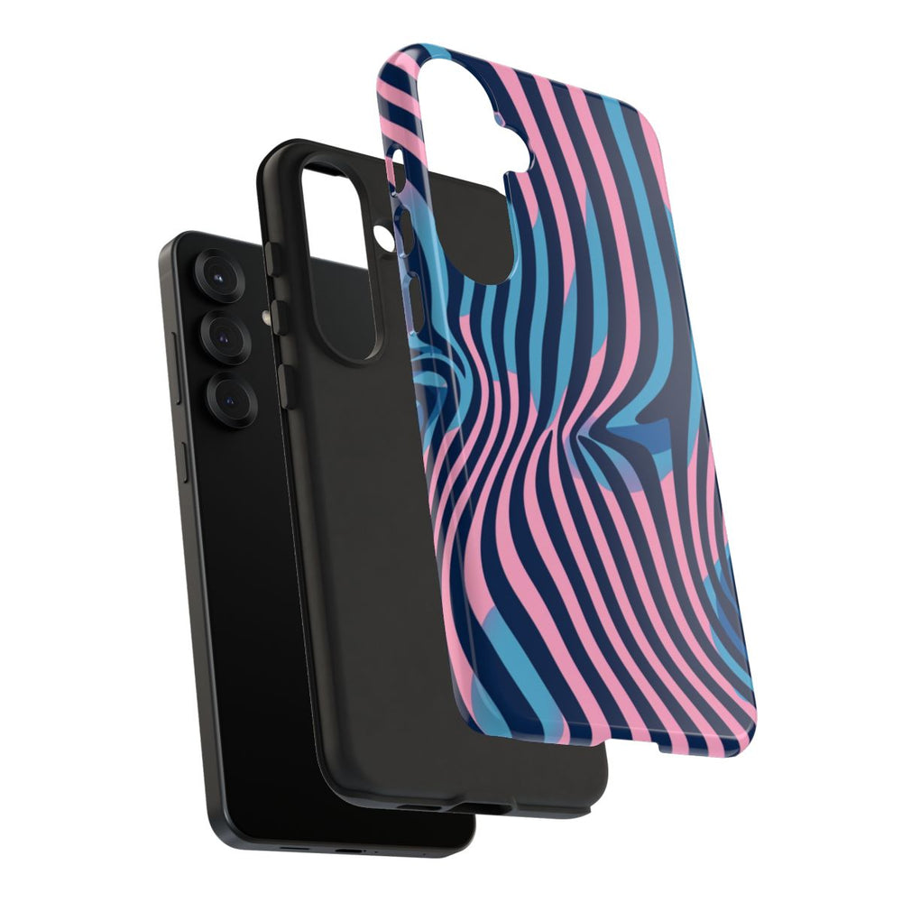 Dit telefoonhoesje heeft een opvallend optisch illusiepatroon met golvende, vloeiende lijnen in blauwe en roze tinten. De lijnen zorgen voor een gevoel van beweging en diepte, wat het ontwerp een speels en psychedelisch karakter geeft. Het patroon loopt diagonaal over het hoesje, waardoor het dynamische effect extra wordt versterkt. Dit glanzende, stevige hoesje is gemaakt van een polycarbonaat buitenkant met een TPU binnenzijde en biedt dubbele bescherming. Het ondersteunt draadloos opladen en is bestand tegen weersinvloeden, zodat het ontwerp langdurig mooi blijft.