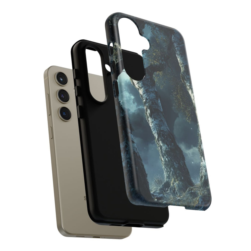 Dit hoesje toont drie grote berkenbomen met dikke, opvallende schors die dicht bij elkaar staan in een sfeervol, donker bos. Een mysterieuze lichtbron verlicht de bomen en het omliggende bladerdek en zorgt voor een magische gloed. Op de achtergrond zie je een bewolkte, onstuimige lucht met subtiele sterren. Het stevige, matte hoesje bestaat uit twee lagen van polycarbonaat en TPU, biedt uitstekende bescherming tegen stoten en weersinvloeden en ondersteunt draadloos opladen.