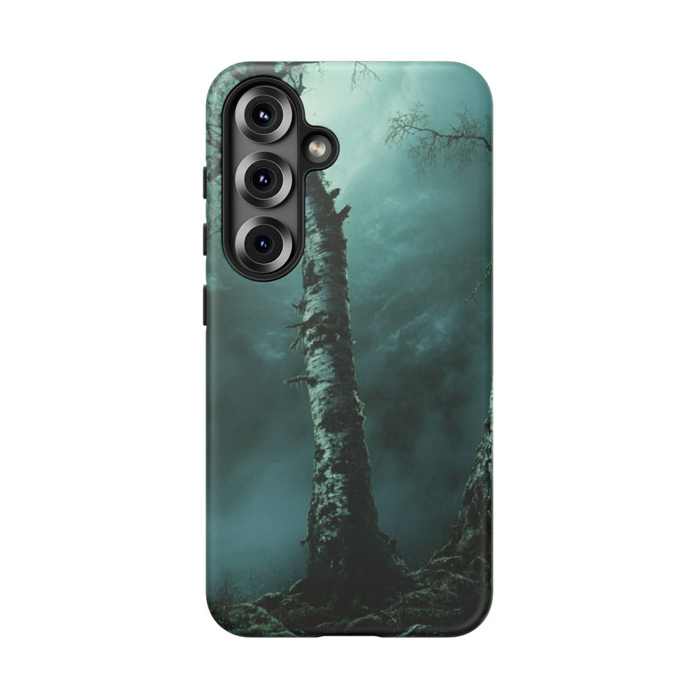 Dit ontwerp toont drie hoge, robuuste berkenbomen met opvallende schors, staand op een met mos bedekte bosgrond. De scene speelt zich af onder een dreigende, bewolkte hemel waar vaag licht doorheen breekt, wat zorgt voor een mysterieuze en gotische sfeer. Het hoesje heeft een matte afwerking en bestaat uit twee lagen: een stevige polycarbonaat buitenkant en een TPU-binnenzijde. Het ondersteunt draadloos opladen en biedt bescherming tegen weersinvloeden.