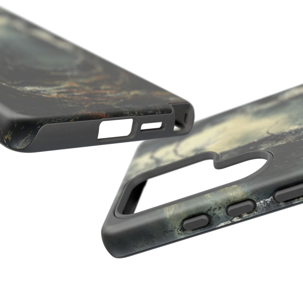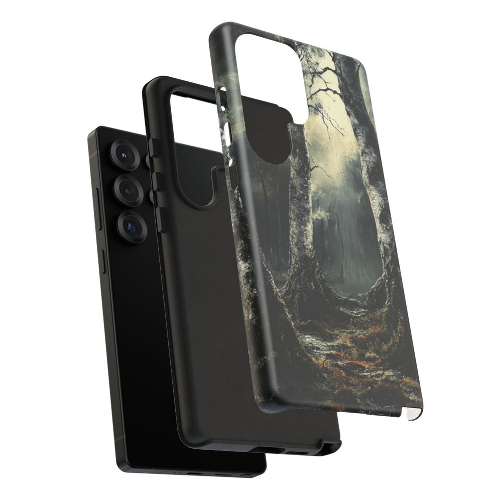 Dit hoesje is voorzien van een donker, sfeervol boslandschap met vier grote berkenbomen die duidelijk op de voorgrond te zien zijn. De bomen hebben dikke, getextureerde stammen met zichtbare bastdetails. Het licht valt gefilterd door het dichte bladerdak en zorgt voor een mysterieuze sfeer met schaduwen en lichtaccenten. De bosgrond is bedekt met mos en verspreid blad. Het hoesje heeft een stevige dubbele laag van polycarbonaat en TPU en ondersteunt draadloos opladen.